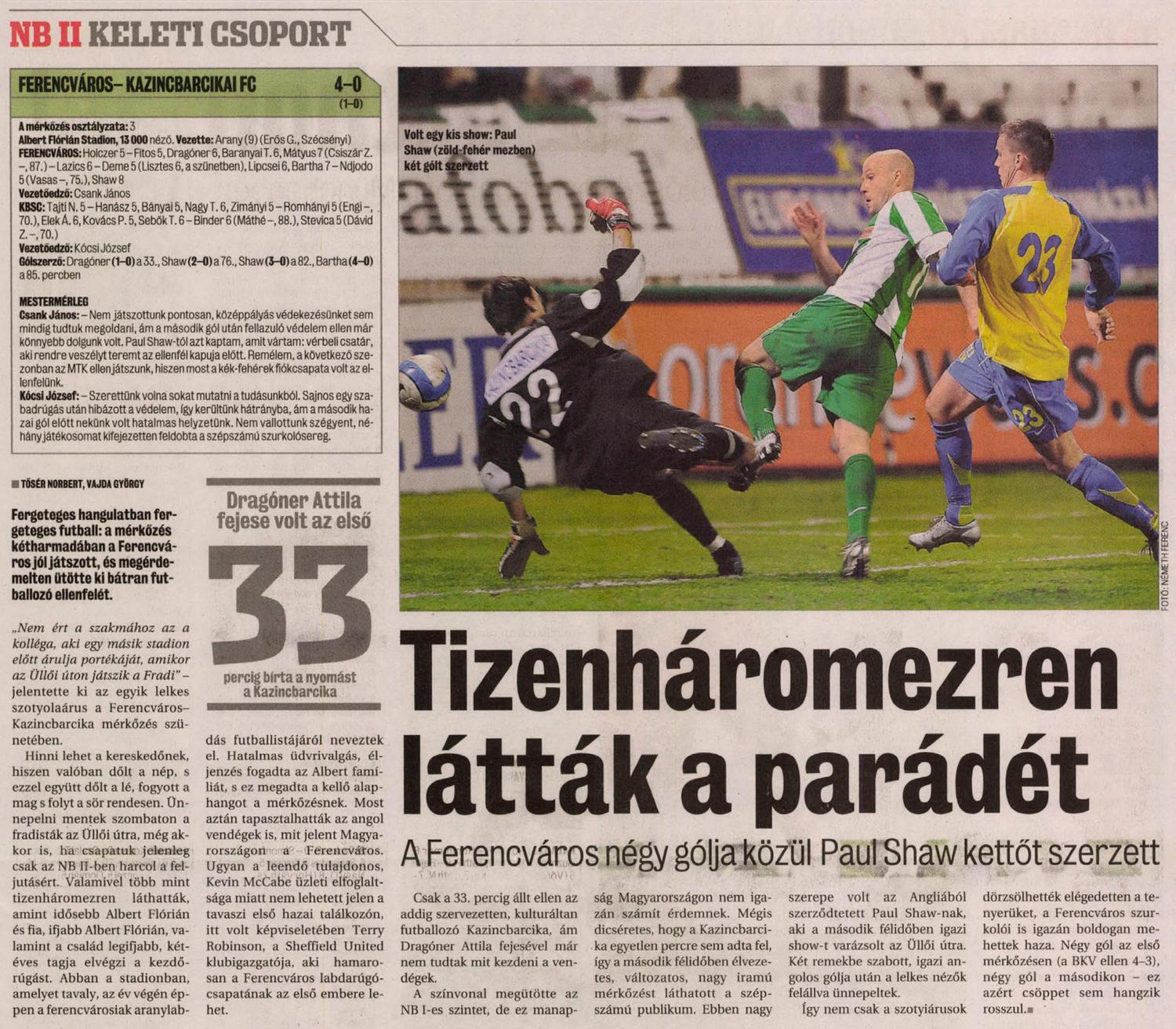 ftc.hu: Csapatunk 4-0-ra verte a Kazincbarcikát. Kiváló hangulatú meccsen, 12 ezer néző előtt sikerrel köszöntöttük az Albert-stadiont. Góljainkat Dragóner, Shaw és Bartha szerezték.