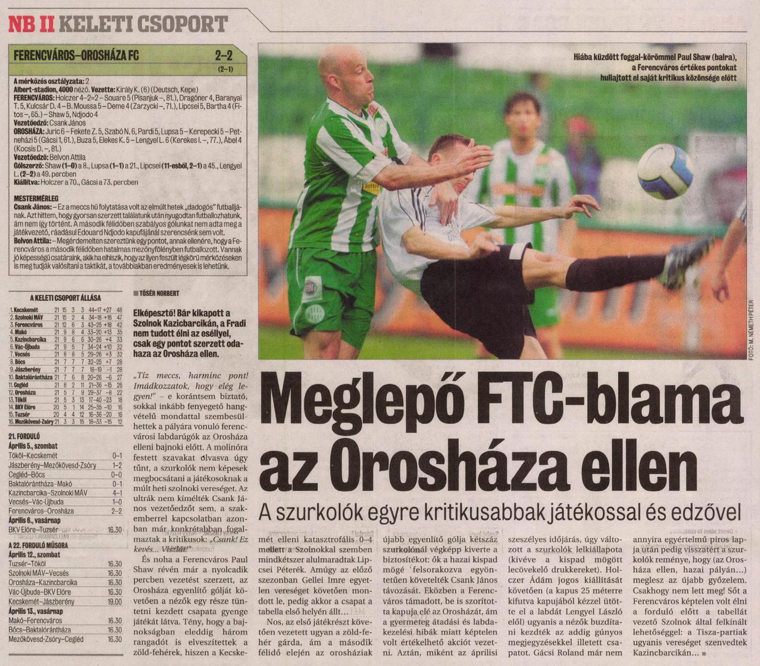 ftc.hu: Nagy esélyt szalasztottunk el a felzárkózásra, miután hazai pályán csak 2-2-es döntetlent játszottunk az Orosházával. Kétszer is vezettünk a találkozón, de a vendégek mindkétszer egyenlítettek. Mindkét együttes tíz-tíz emberrel fejezte be a találkozót Holczre, illetve Gácsi kiállítása miatt. A Szolnokon egy pontot hoztunk, a Kecskemét viszont növelte előnyét velünk szemben.