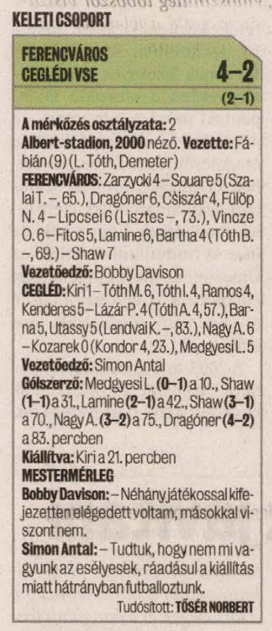 ftc.hu: Győzelemmel búcsúztunk az Albert-stadiontól. Csapatunk 4-2-re legyőzte a Ceglédet, így némi esély továbbra is maradt a második hely megszerzésére. Góljainkat Shaw (2), Lamine és Dragóner szerezték. A meccs nagy részében emberelőnyben játszottunk.