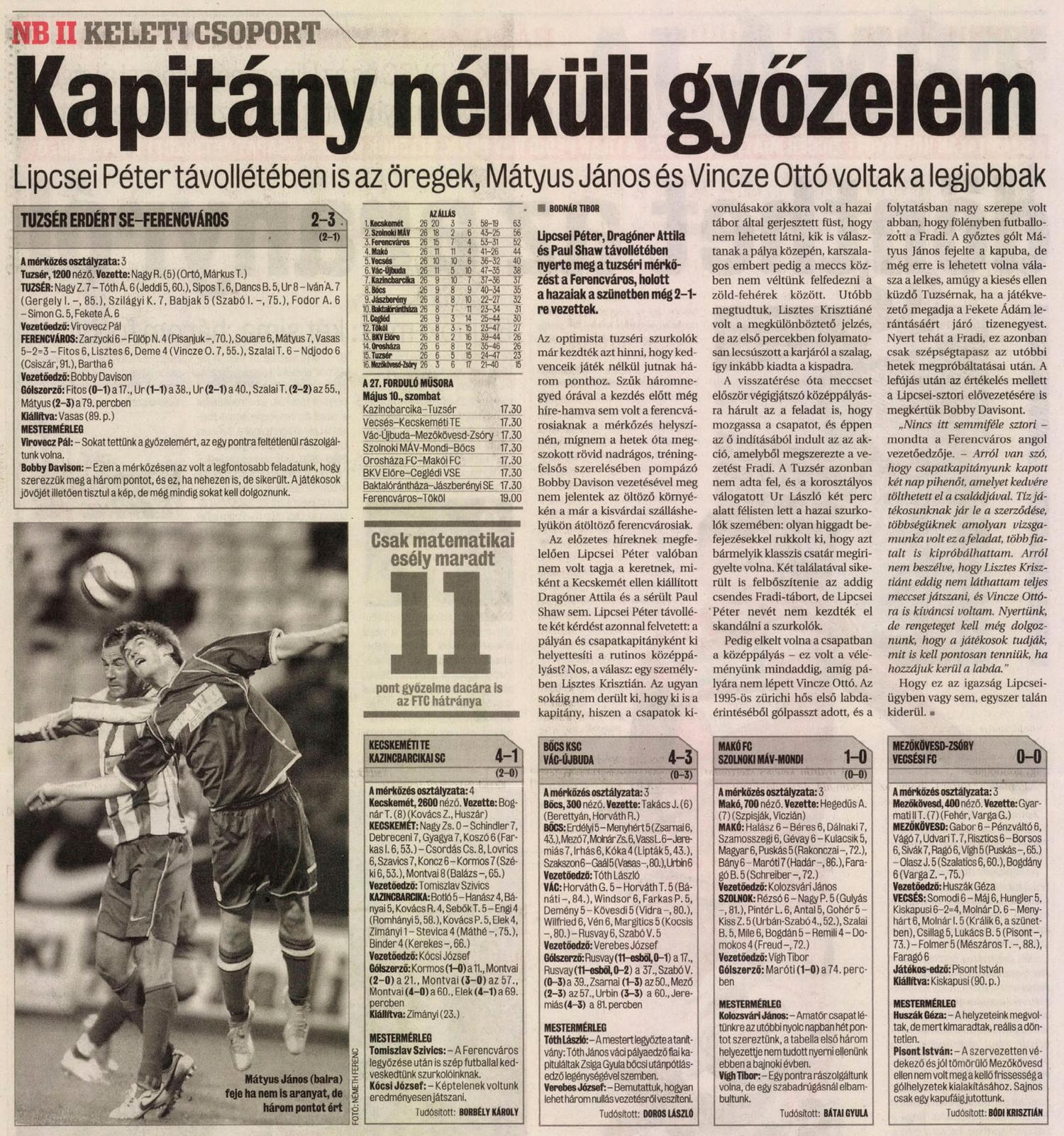 Fordulatos meccsen végül 3–2-re nyert a Fradi a Tuzsér vendégeként a magyar labdarúgó NB II. 26. fordulójában. Ur László kétszer villant az első félidőben, azonban Szalai Tamás és Mátyus János góljaival fordított a Ferencváros.
