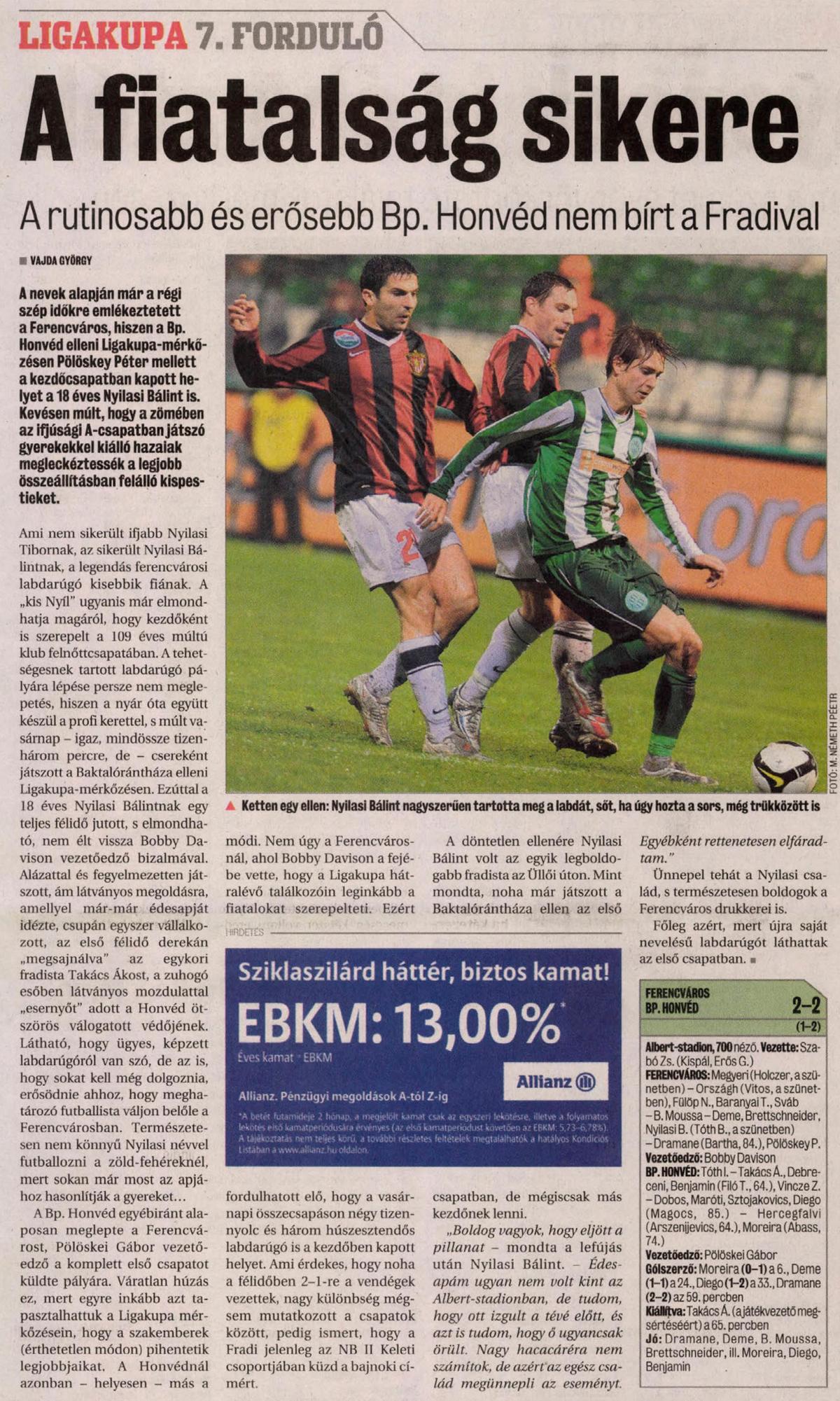 ftc.hu: Csapatunk 2-2-es döntetlent játszott a Ligakupában a Honvéd ellen. A mieink kétszer is hátrányba került, ám előbb Deme, majd pedig Kamate egyenlített. A csoportunkban így továbbra sem dőlt el a továbbjutás kérdése.