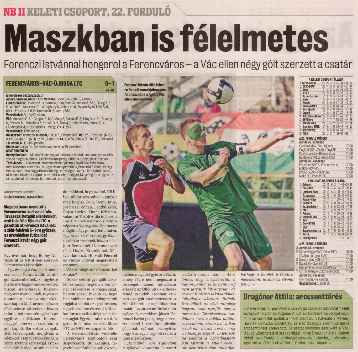 A másodosztályú labdarúgó-bajnokság 22. fordulójában a Keleti csoportot vezető Ferencváros a négy gólt szerző Ferenczi István vezérletével hazai pályán sima, 6–1-es győzelmet aratott a mérkőzést tíz emberrel befejező Vác ellen. A meccsen súlyosnak tűnő sérülést szenvedett Dragóner Attila, akit a szünetben mentő szállított kórházba.
