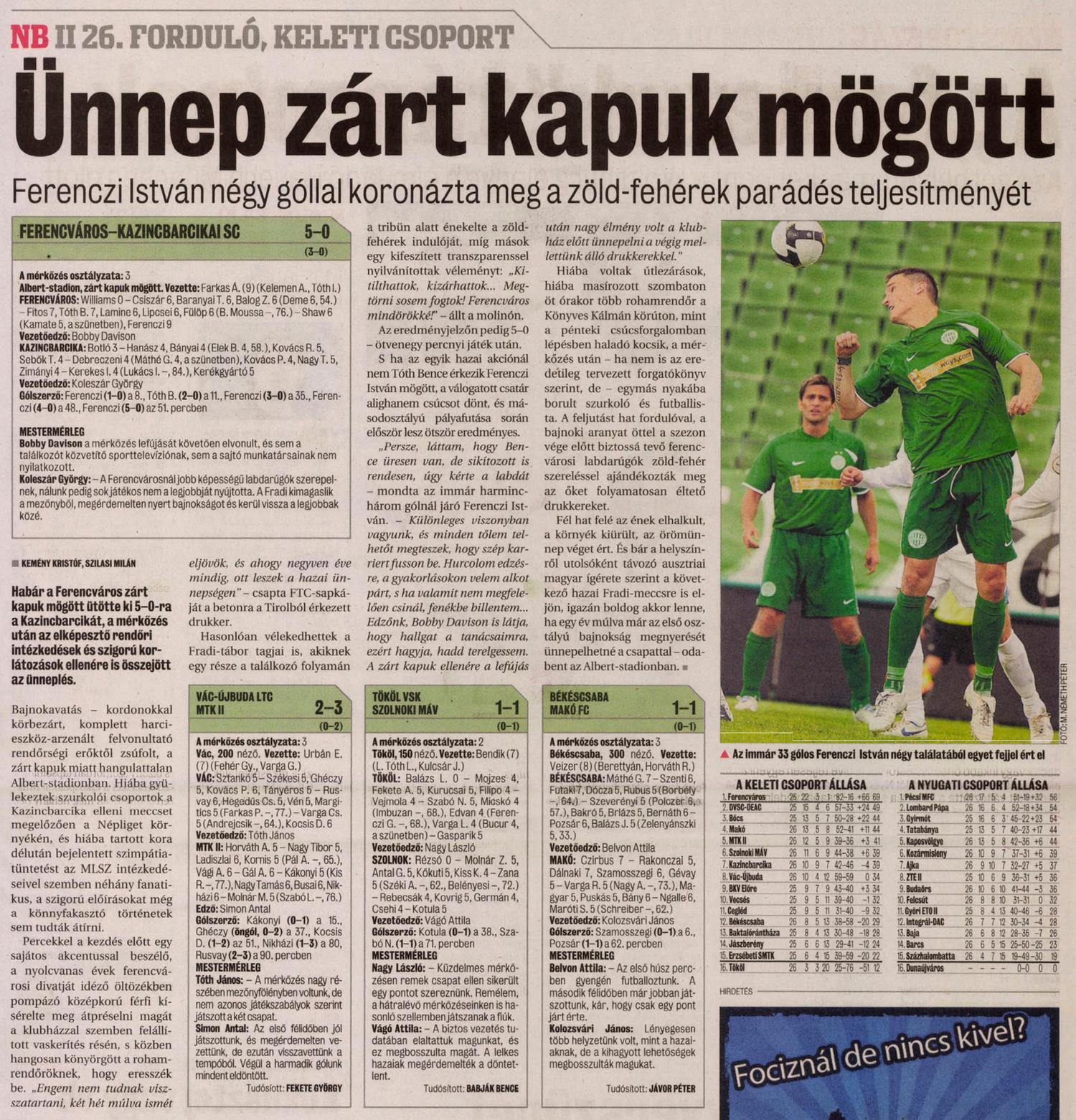 A már bajnok Ferencváros az ötödik Kazincbarcikát fogadta zárt kapuk mögött az Albert Flórián Stadionban, a labdarúgó NB II Keleti csoportjának 26. fordulójában.
