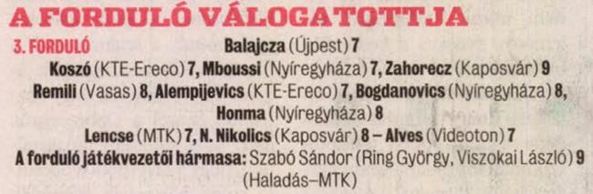 A Nyíregyháza kapujában Drasko Vojinovics még gól nélküli állásnál mutatott be egy bravúrt. A védelemben Yves Simplice Mboussi az eddigi két meccsel ellentétben ezúttal nem hozott össze tizenegyest, Sabin-Cosmin Goia erejéből pedig a góllövésre is „futotta”, igaz, rossz kapuba talált be… Támadásban Igor Bogdanovics még akkor is villogott, amikor a második félidőben Jason Morrison személyében külön őrzőt kapott, Honma Kazuo két csodás gólt szerzett, Sindou Dosso önbizalmának pedig jót tett a korán lőtt gól. A Fradi kapusát, Holczer Ádámot mintha váratlanul érte volna a második gól előtti lövés. A védelemből Kulcsár Dávid két gólnál is hibázott, ezt csak némileg ellensúlyozta a szépítés előtti cselsorozata. James Ashmore csupán szabadrúgásokból bizonyult veszélyesnek, Ferenczi István a második meccsén sem talált be. Hazai „hangzavar”.