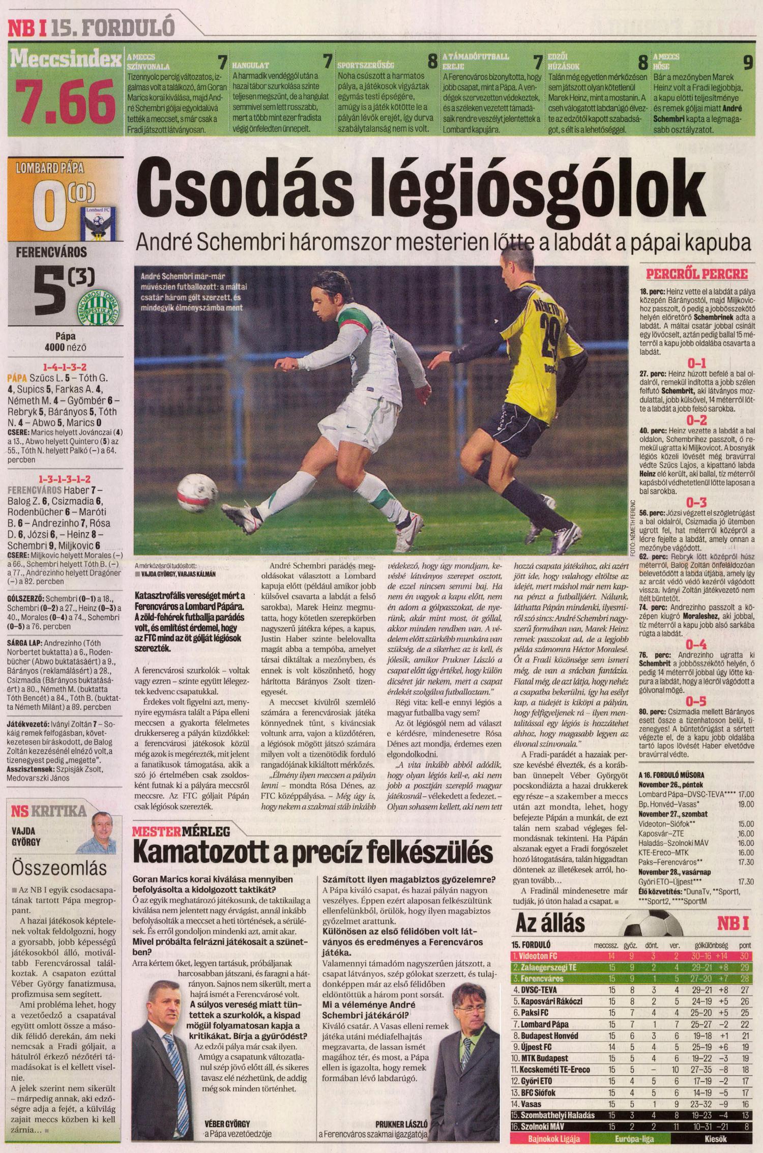 Véber György: – Kellő optimizmussal várjuk a zöldeket. Noha a múlt héten kikaptunk az MTK-tól, a vereség a mi malmunkra hajthatja a vizet. A hazai sikerek után a kudarc újra rendet tett a fejekben, észbe kaptak a játékosok – s remélem, tudatosult bennük, hogy csakis fegyelmezett, tudatos futballal lehetünk eredményesek. Bármennyire is hihetetlen, az én szememben rangadó lett a Lombard–Fradi, mégpedig a helyezésünk alapján. Ha nyerünk, megelőzzük a Fradit, rátapadhatunk az élmezőnyre, és az őszt az ötödik-hatodik helyen zárhatjuk. Tudom, sokan megmosolyognak, de azért büszke vagyok rá, hogy az egykori kettős rangadók résztvevőit, a Vasast, az Újpestet és a Honvédot is megvertük. Már csak a Fradi van hátra, ez újabb lépcsőfok, s remélem, senki sem szédül el a magasságtól. Persze nem lesz könnyű, mivel ellenfelünk a legjobb összeállításában játszik, míg nálunk két alapember hiányzik. Nem számíthatok Takács Péterre, s az egyre jobb formában futballozó Heffler Norbertre sem. Így Tóth Gábor és Tóth Norbert élhet a lehetőséggel. Tóth Gábor magassága, fejelőtudása hasznunkra lehet, mert a Fradi szabadrúgásokból és szögletek utáni szituációkból eredményes.