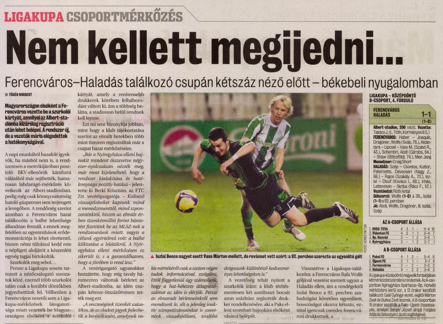 A Ligakupa középdöntőjének B-csoportjában a Ferencváros 1–1-es döntetlent játszott hazai pályán a Haladással. A Fradi Rafa Wolfe első félidőben lőtt góljával szerezte meg a vezetést, Iszlai Bence azonban a mérkőzés hosszabbításában egyenlített.