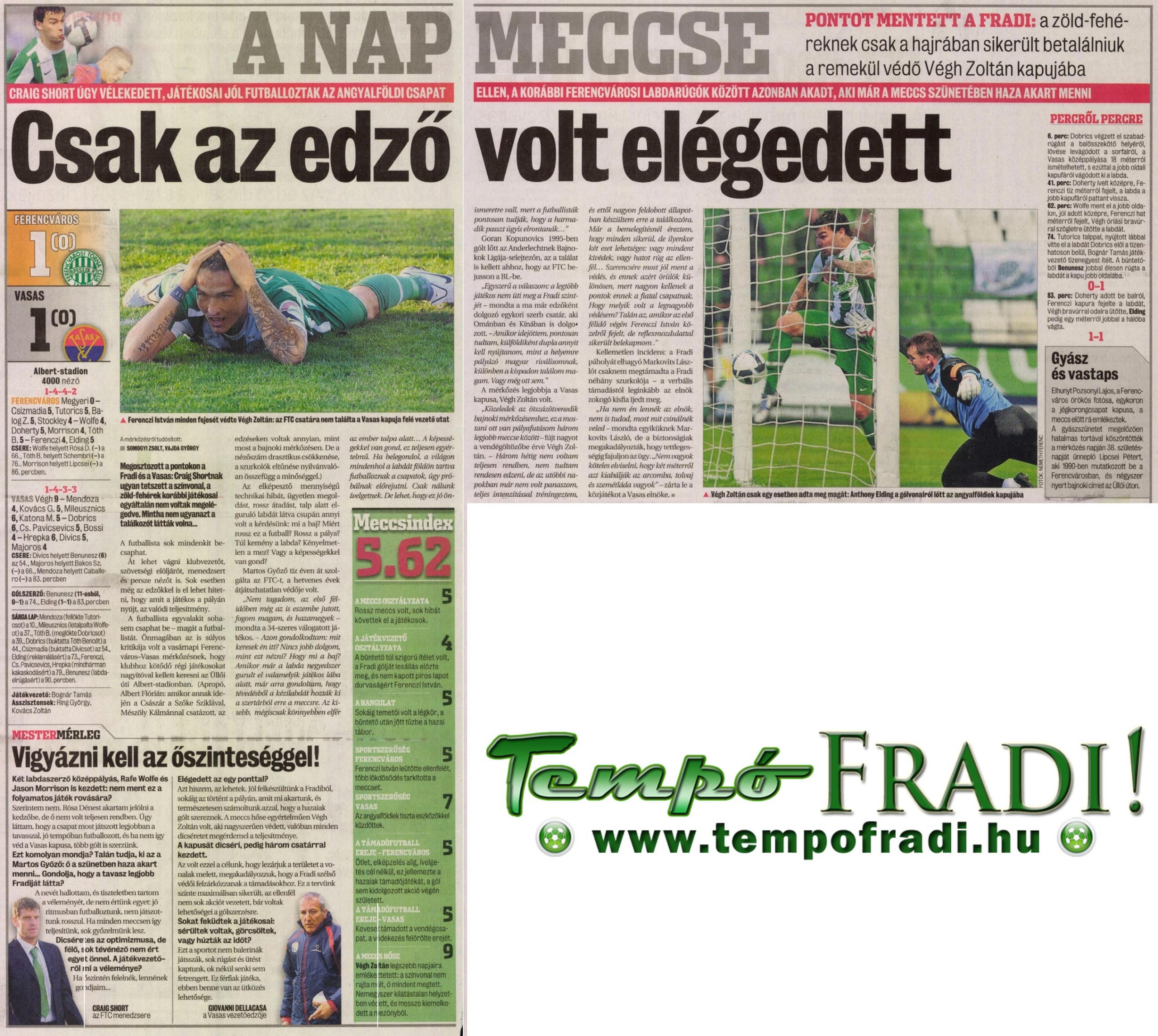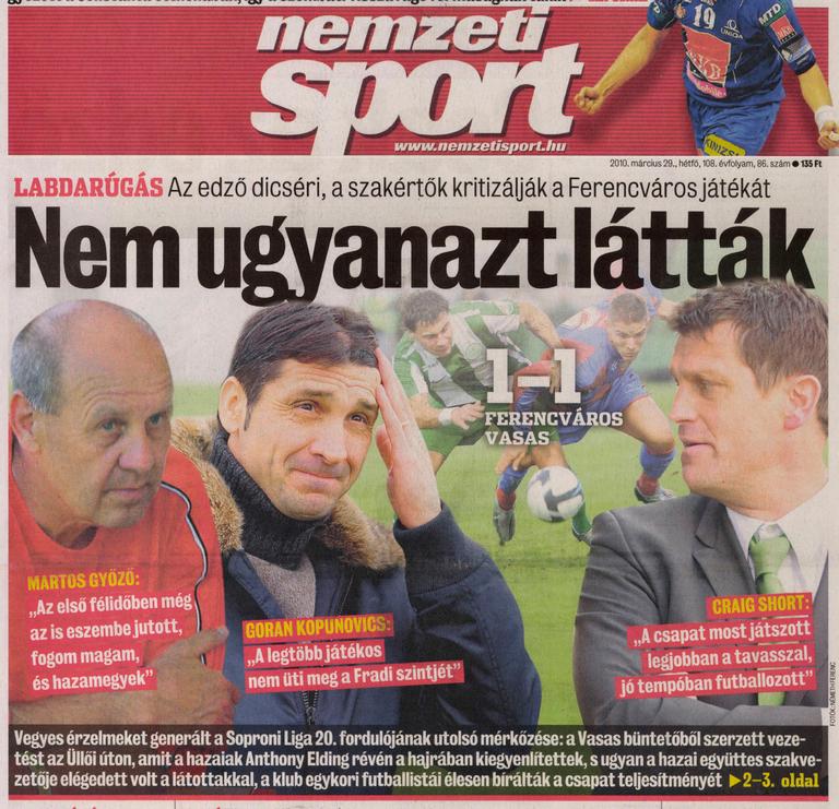 Craig Short: – Nagyon mérges vagyok, egyszerűen nem tudom elhinni a tizenegyes előtti döntést, bár nem akarok mindig a játékvezetőkre panaszkodni… A tavasszal most játszottunk a legjobban, jó tempóban játszottunk, sok helyzetet dolgoztunk ki. A Vasas kapusa fantasztikusan védett. Nyernünk kellett volna, de ebben megakadályozott minket egy elképesztő döntés.