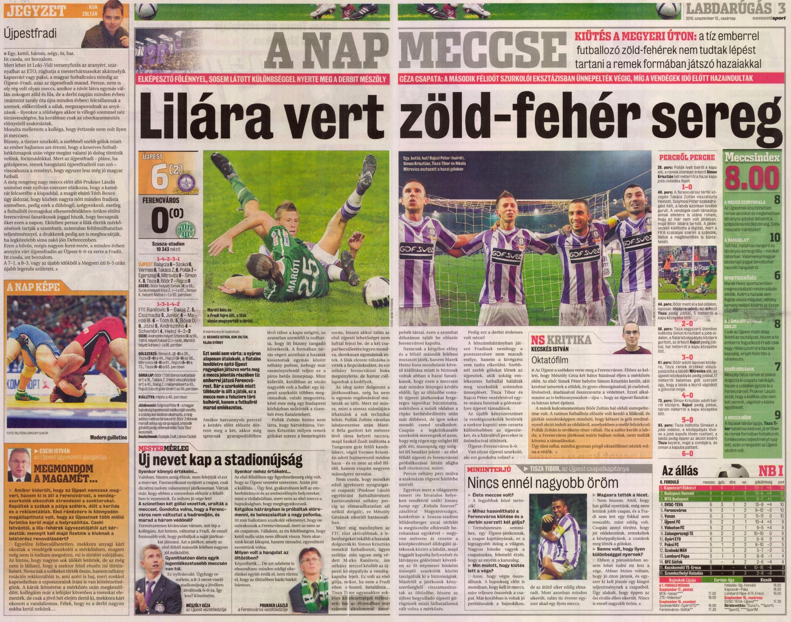 Az Újpest hazai pályán 6–0-ra nyert a Ferencváros ellen a labdarúgó NB I 6. fordulójának rangadóján. A lilák Simon Krisztián góljával szereztek vezetést, majd Marek Heinz kiállításával a 40. percben emberelőnybe kerültek. Tisza Tibor még a szünet előtt növelte a hazaiak előnyét, a második félidőben pedig már csak egy csapat volt a pályán.