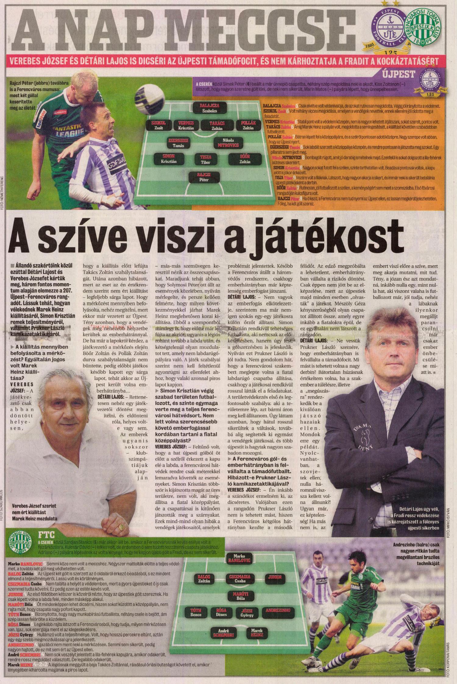 – Elkeseredett voltam, hogy a mérkőzésen szurkolóinkat olyan helyzetbe hoztuk, hogy ők is elveszíthették a fejüket. Reggel 6-ig én sem aludtam a mérkőzés után, visszanéztem még a meccset az éjjel, de pár csapattársam ugyanígy tett. Az első félidő összességében rendben lett volna. Úgy mentünk ki, hogy az elején eldöntjük a mérkőzést, aztán fieszta lesz, sajnos nem ez történt. Az Újpest mélységi indításokkal, a szélről próbálta megbontani a csapatot, az első két gól sajnos pont ebből született. Az eredmény után rohantunk, már nem a saját játékunkat játszottuk. A pirosig partiban voltunk, sőt még éreztem tartalékokat a csapatban. Nagyjából, az ötödik gól árult el mindent: az a pillanat, amikor Stanic elcsúszott, ott már látható volt, kicsúszott a kezünkből az egész mérkőzés. 3-0-nál volt egy nagy helyzetem, ha az bemegy, akkor megint más a szituáció. 4-0 után már sokkal mélyebben játszottunk, nem edzői utasításra, de mi is próbáltunk mélyebben védekezni, de ezen a meccsen minden összejött az Újpestnek.