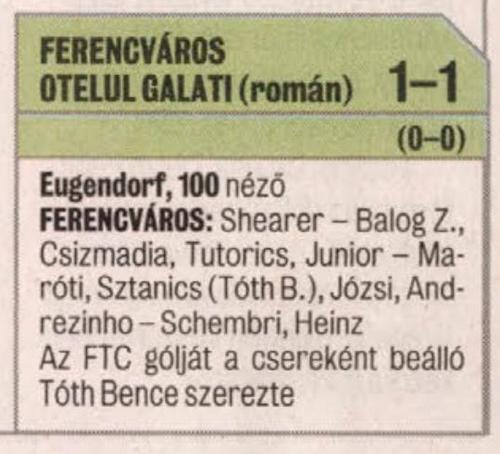 Ferencváros: Shearer (Vasek 46.) – Balog Z. (csk) (Kulcsár D. 55.), Csizmadia (Vass 71.), Tutoric (Gramann 46.), Junior (Stockley 46.) – Maróti (Rodenbücher 46.) – Andrezinho (Rósa 46.), Stanic (Tóth B. 46.), Józsi (Pisanjuk 65.) – Schembri (Danquah 46.), Heinz (Abdi 58.)