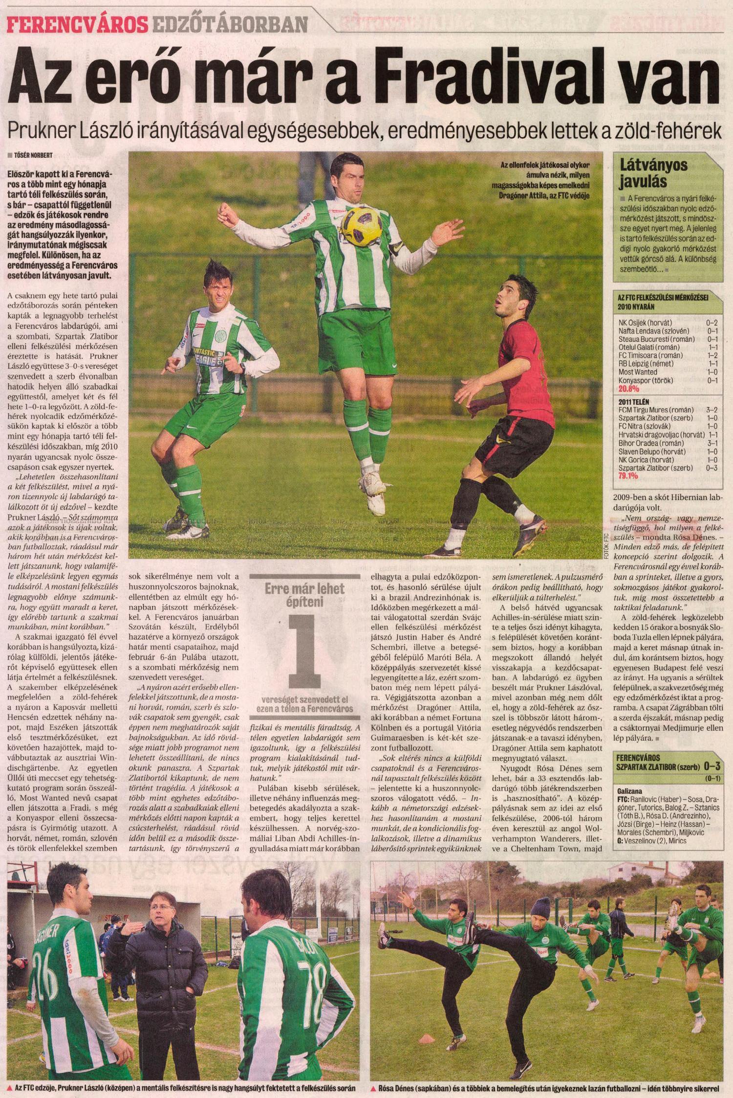 Prukner László: – Lehetetlen összehasonlítani a nyári és a mostani felkészülést, hisz akkor 18 új játékost kellett beépítenem, s a régiekkel is meg kellett ismerkednem, mindössze három hét alatt. A mostani felkészülés legnagyobb előnye, hogy egyben maradt a keret, így előrébb tartunk, mint korábban. A nyáron erősebb ellenfeleink voltak – a mostaniak sem gyengék, csak nem meghatározóak a bajnokságaikban. Az idő rövidsége miatt jobb programot összeállítani lehetetlen lett volna. A Szabadkától kikaptunk, de ez nem tragédia – a játékosok a több, mint egy hetes pulai felkészülés legkomolyabb terhelését kapták meg pénteken, ráadásul ez rövid időn belül a második összetartás, így törvényszerű a mentális és fizikai fáradtság. A télen senkit nem igazoltunk, így mindenkitől tudtuk, mit várhatunk el.