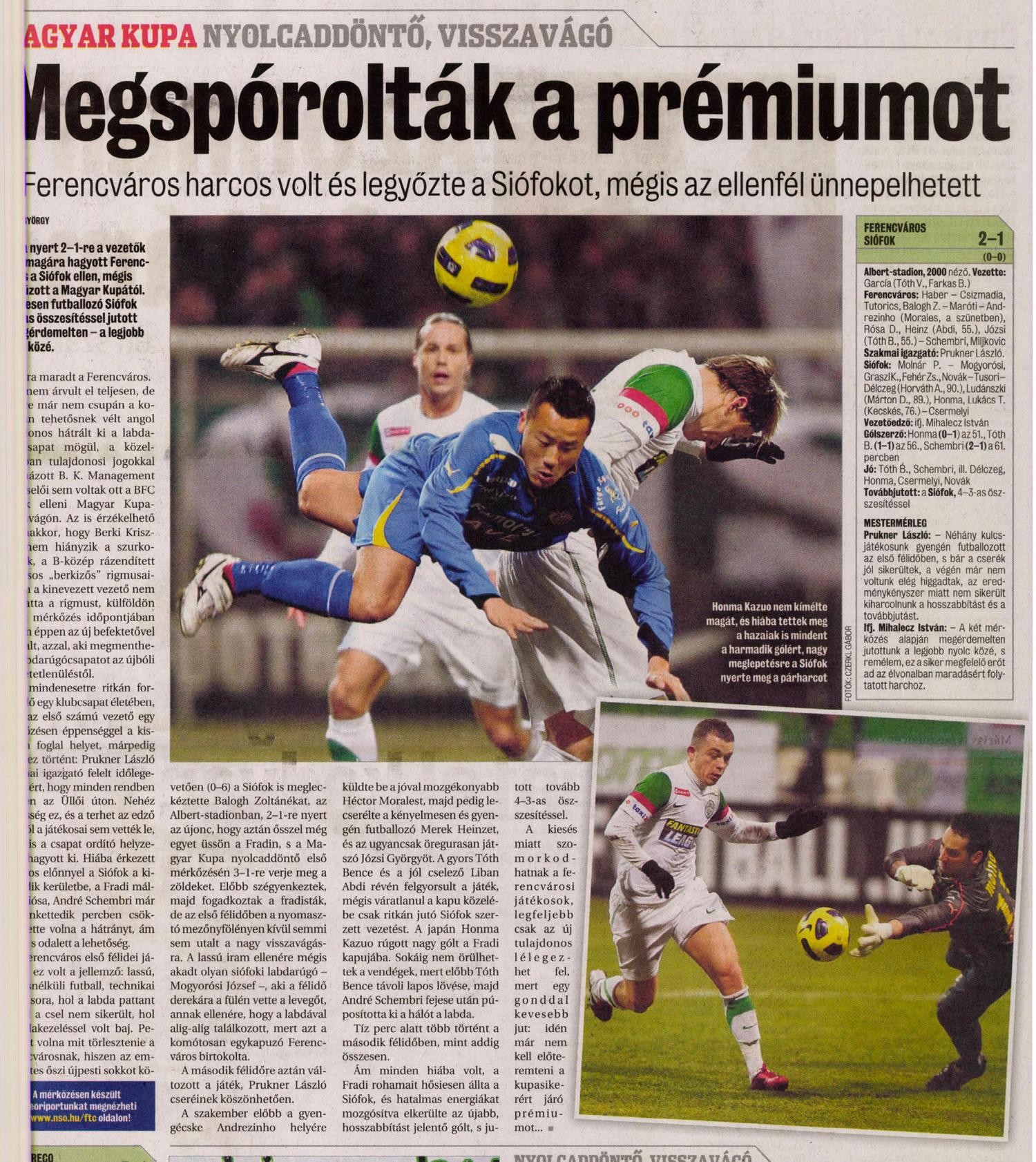 „A siófoki vereség miatt az első perctől kezdve kényszerpályán voltunk, kezdettől fogva előre kellett mennünk, ebben benne van a kapott gól, de elkerülhető volt a Siófok találata. Néhány játékos nagyon halovány volt. A cserék jót tettek, de ez a továbbjutás nem most, hanem Siófokon ment el – mondta Prukner László, a Ferencváros szakmai igazgatója majd visszautalt a Kecskemét elleni pénteki bajnokira is. – Az első félidőink haloványak mostanában, ezen mindenképpen javítanunk kell.”