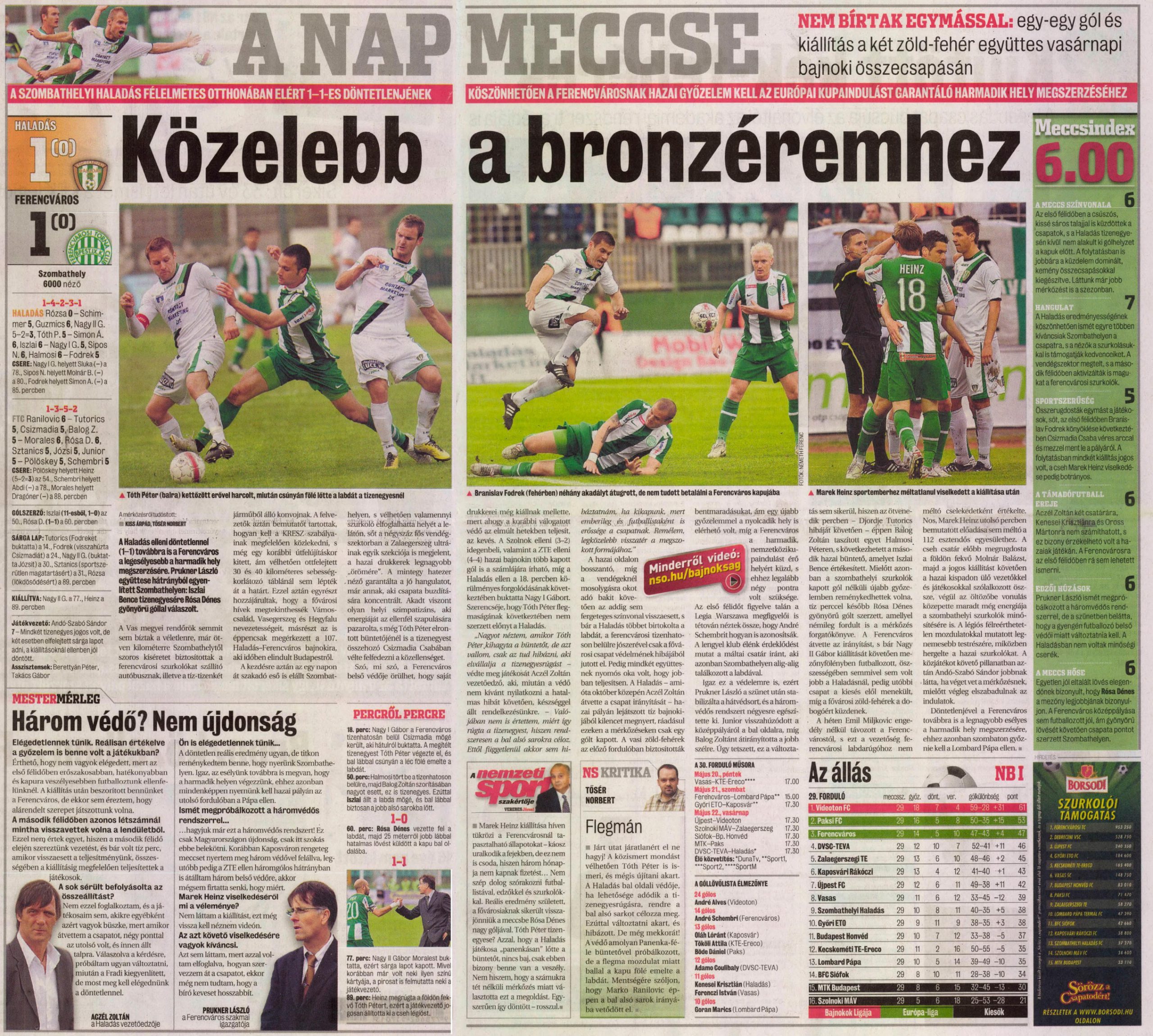 A labdarúgó NB I 29. fordulójának záró mérkőzésén a Ferencváros 1–1-es döntetlent játszott a Haladás otthonában. A vezetést Iszlai Bence szerezte meg a második félidő elején a szombathelyieknek, majd Rósa Dénes egy távoli bombagóllal egyenlített. A mérkőzést mindkét gárda tíz emberrel fejezte be, Tóth Péter pedig büntetőt hibázott az első félidőben.