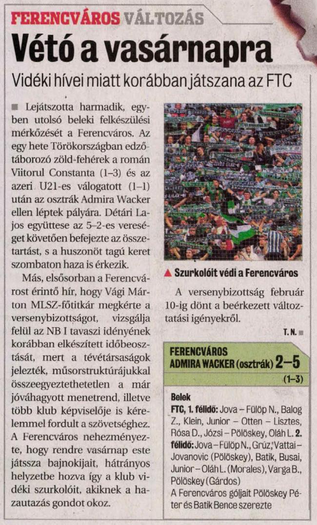 Csapatunk 5-2-es vereséget szenvedett az osztrák bajnokság 5. helyén álló Trenkwalder Admira ellen. Góljainkat Pölöskey és Batik szerezték.