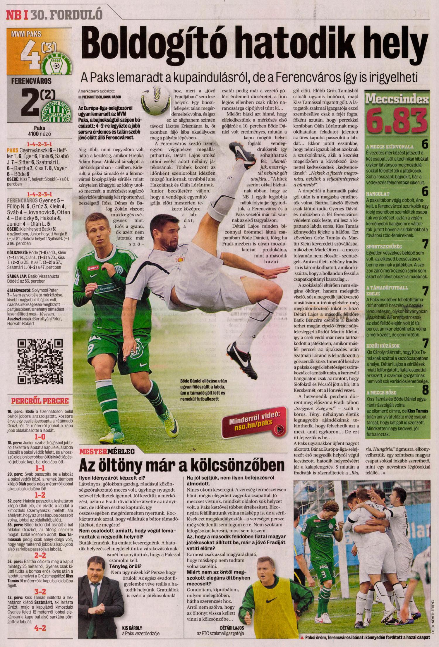 A labdarúgó NB I 30. fordulójában az MVM Paks 4–2-re legyőzte a Ferencvárost. A hazaiak szereztek vezetést Böde góljával, de a Fradi két perc alatt lőtt két góllal fordított. A hazaiak azonban nem estek kétségbe, és a szintén két perc alatt elért két találattal már ők mentek előnnyel pihenőre. A 46. percben rúgott Szatmári-gól után pedig a vendégek már nem tudtak újítani, vagyis nem sikerült megszépíteniük a gyenge szezonjukat.