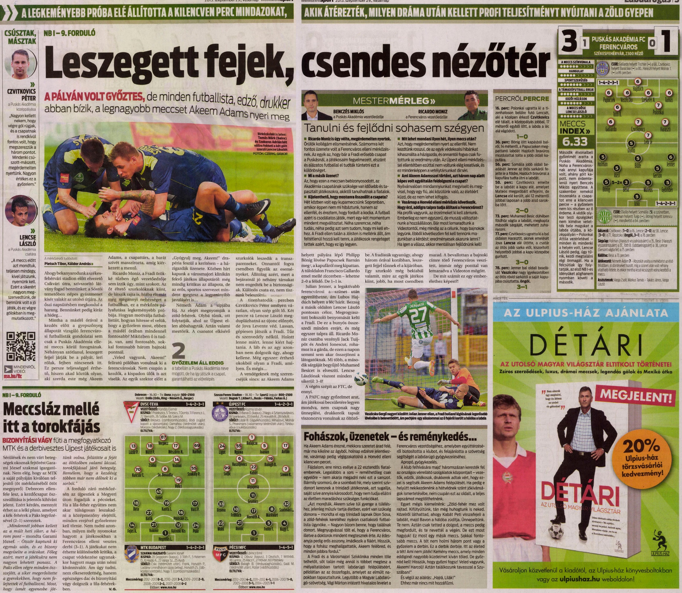 A labdarúgó NB I 9. fordulójában izgalmas, érdekes mérkőzésen a Puskás Akadémia 3–1-re legyőzte Székesfehérváron a Ferencvárost. A fővárosiak Muhamed Besic kiállítása miatt emberhátrányban fejezték be a gólhelyzetekben bővelkedő mérkőzést, amelynek során Julian Jenner a lécet és a kapufát is eltalálta, de a pályaválasztó felcsútiak is elképesztő ziccereket puskáztak el.
