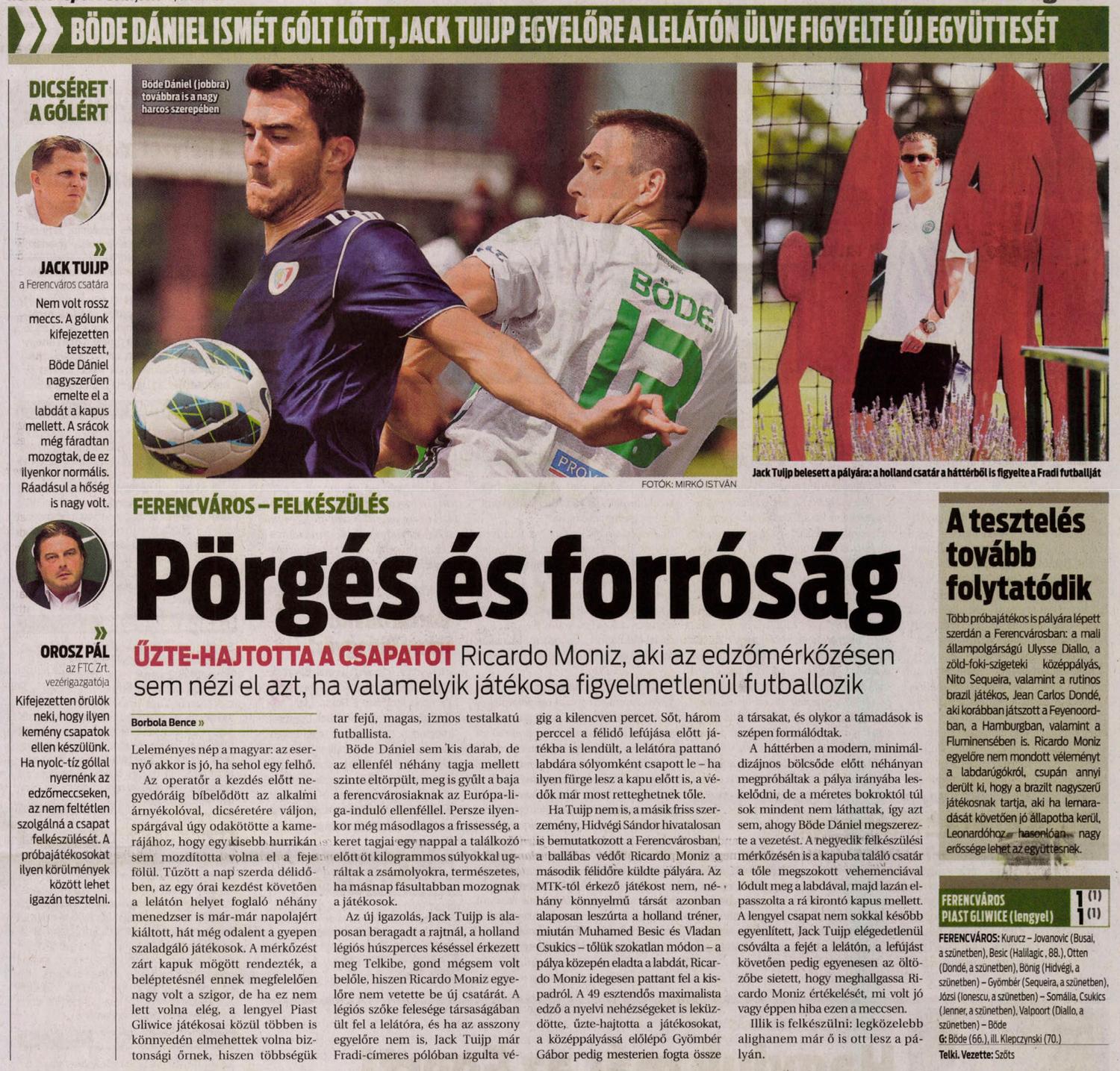 A labdarúgó NB I-ben szereplő Ferencváros felkészülési mérkőzésen 1–1-es döntetlent játszott az Európa-ligában is érdekelt lengyel Piast Gliwicével Telkiben. A zöld-fehérek gólját a negyedik összecsapáson is eredményes Böde Dániel szerezte meg.