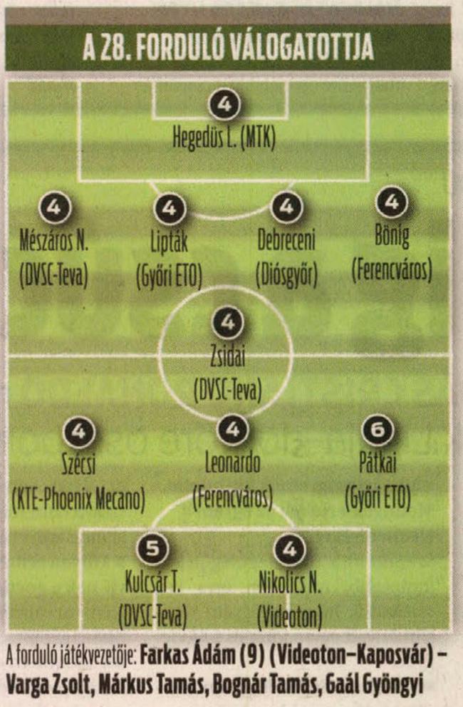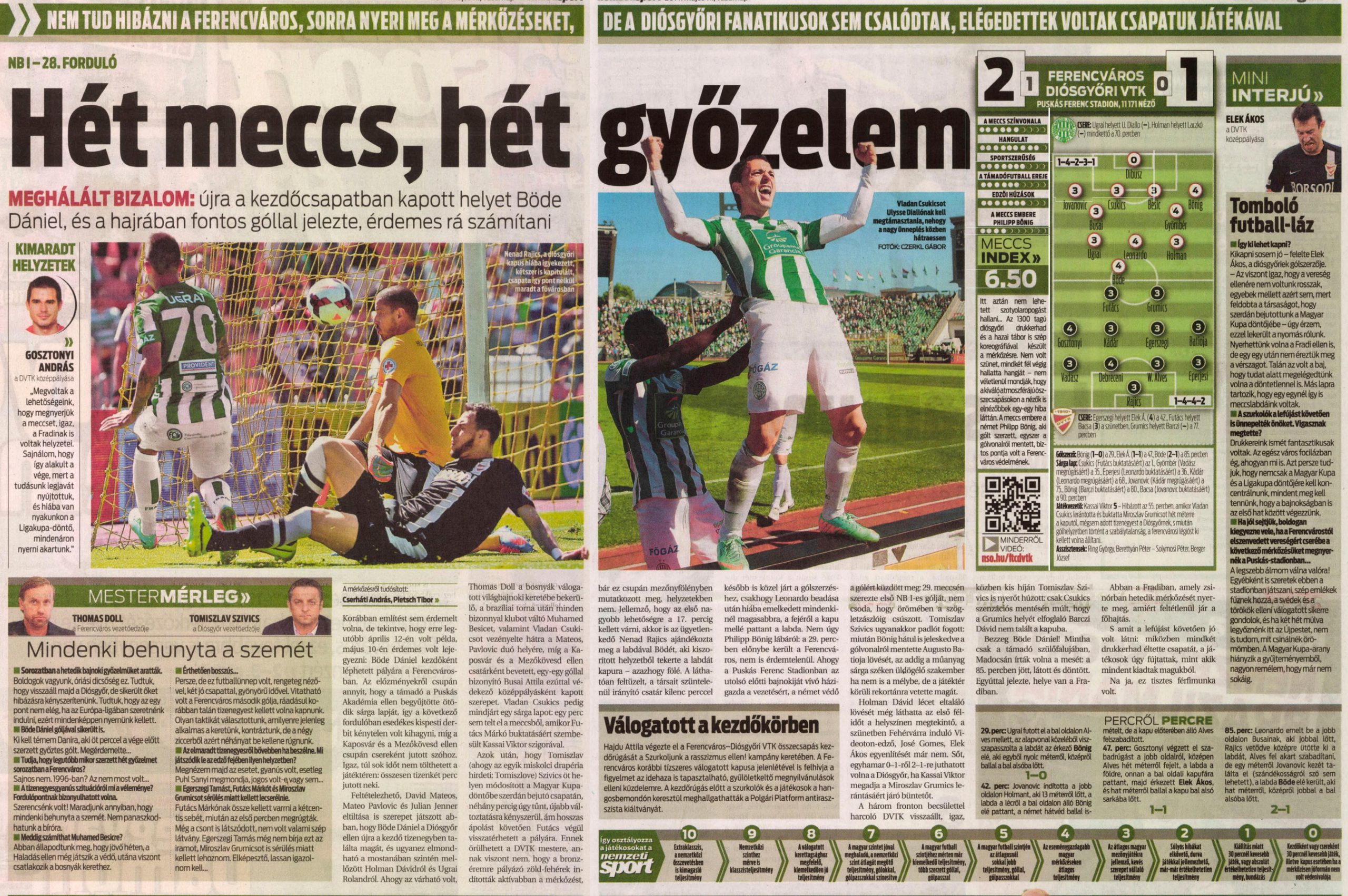 A labdarúgó NB I 28. fordulójának rangadóján a Ferencváros 2–1-re legyőzte a DVTK-t a Puskás Ferenc Stadionban, és feljött a tabella harmadik helyére – míg a Videoton Kaposvár elleni sikerével vissza nem küldte a negyedik pozícióba.