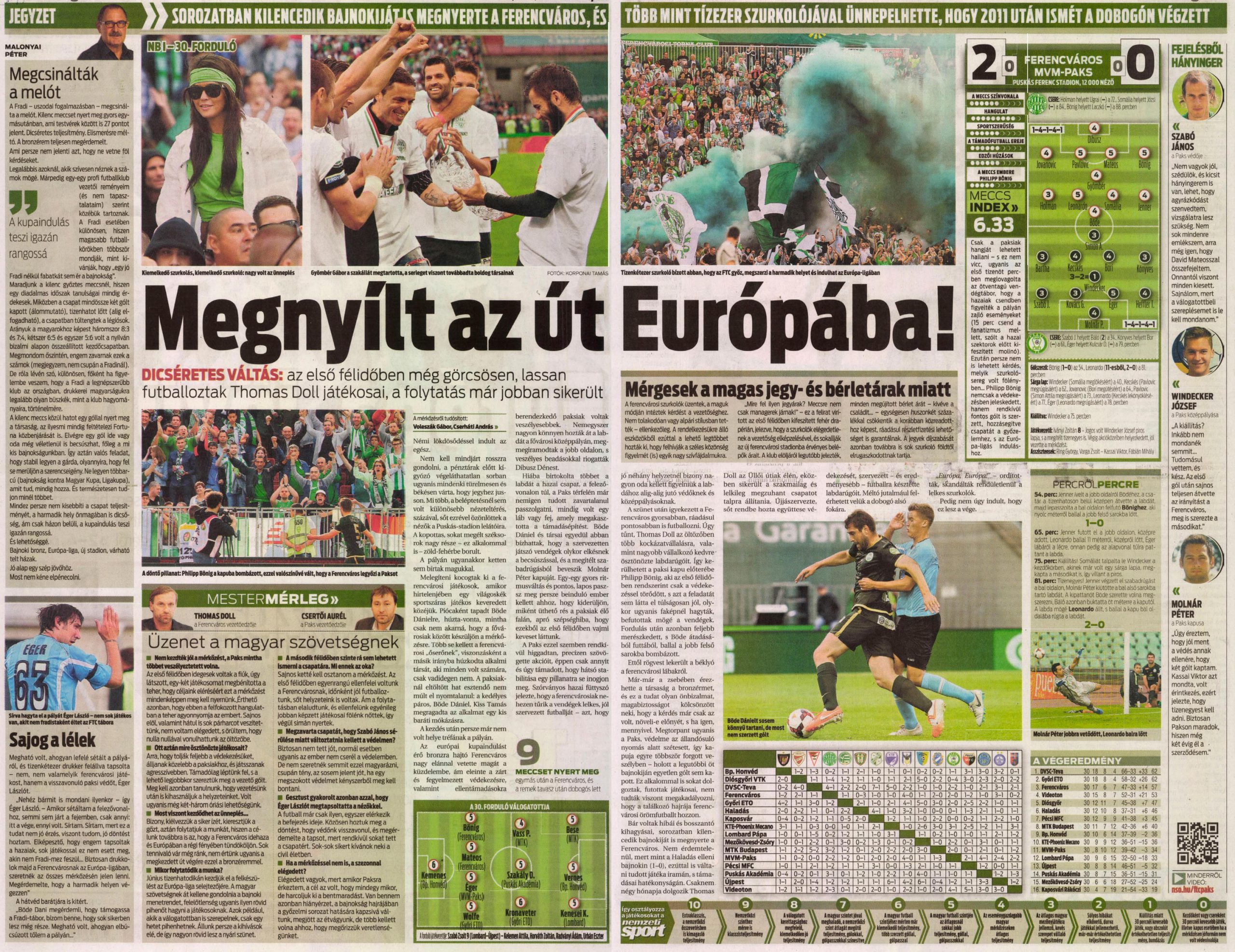 A labdarúgó NB I harmincadik, utolsó fordulójában 2–0-ra győzött a Ferencváros odahaza a Paks ellen, ezzel a fővárosi zöld-fehérek megszerezték a dobogó harmadik helyét és a jogot az Európa-liga-indulásra. A paksiak a 11. helyen végeztek.