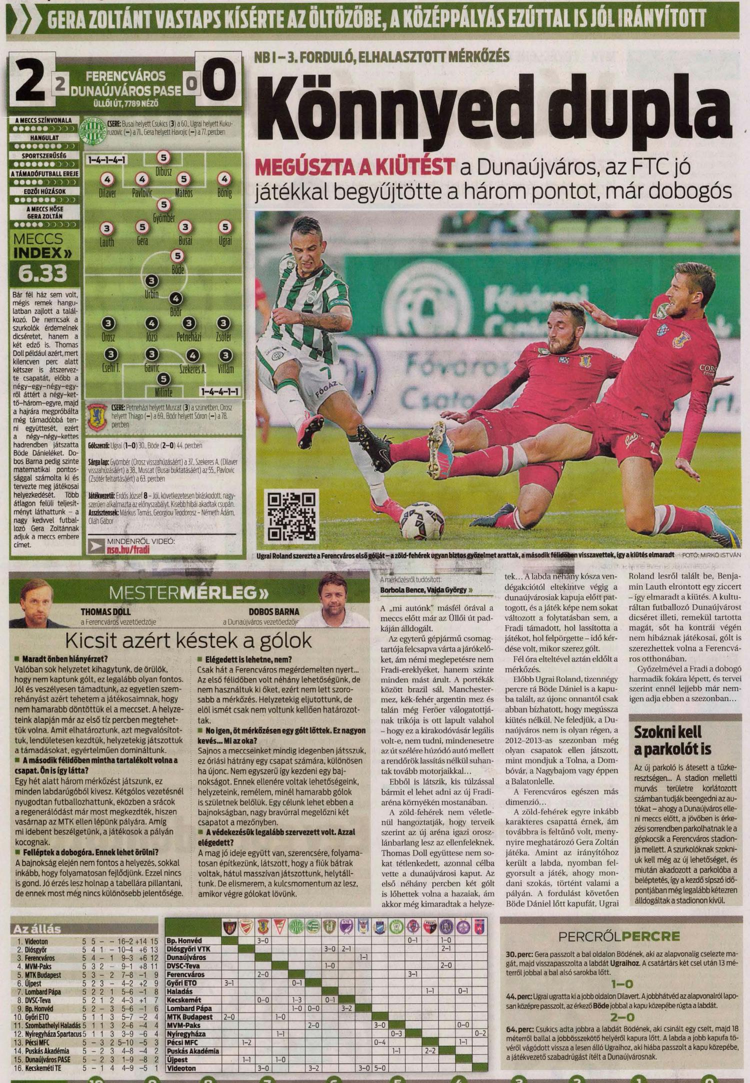A labdarúgó NB I 3.fordulójából bepótolt találkozón a Ferencváros az Üllői úton 2–0-ra legyőzte az újonc Dunaújvárost, és így feljött a tabella harmadik helyére.
