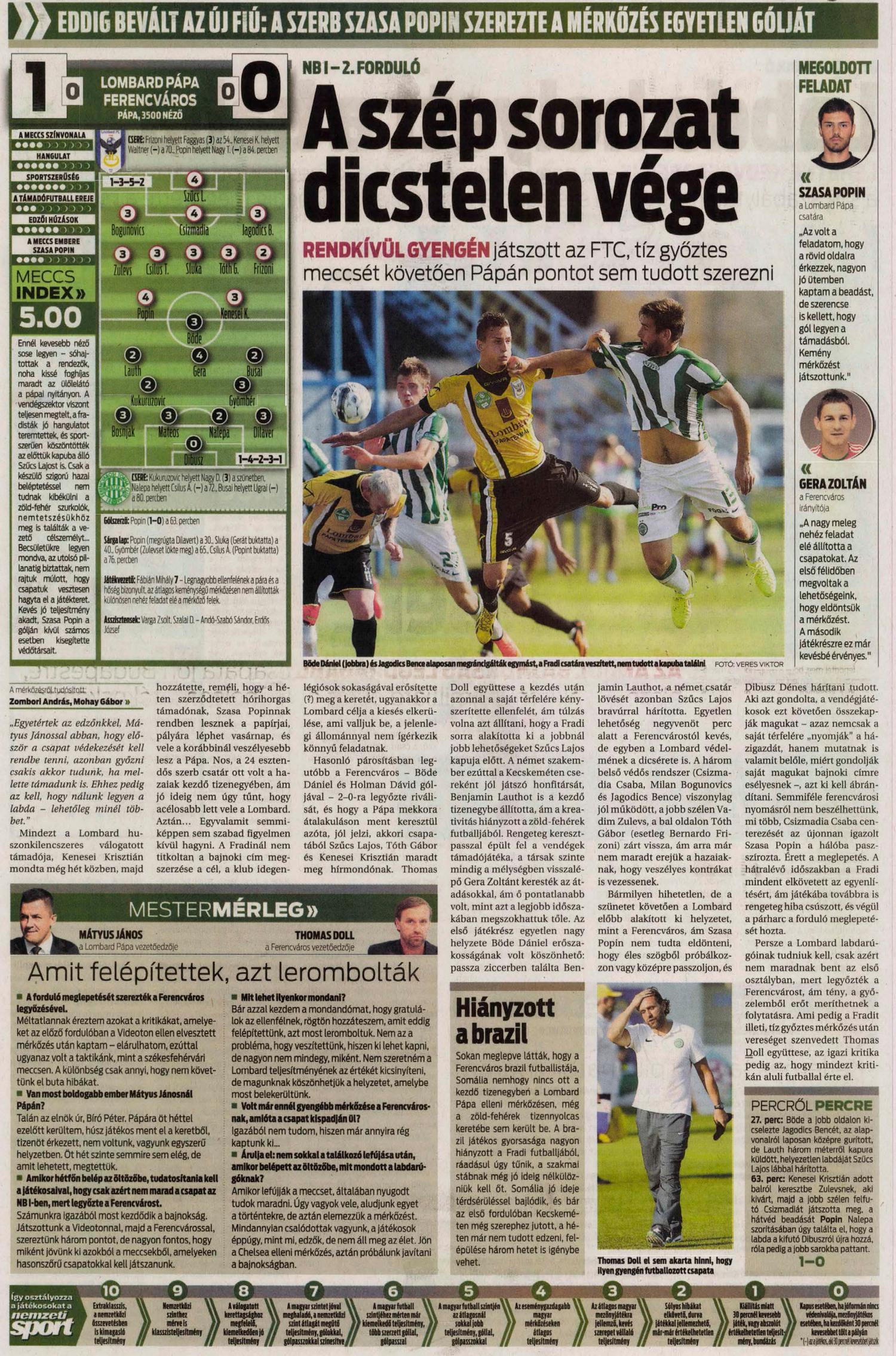 A Lombard nagy meglepetésre 1–0-ra legyőzte hazai pályán a Ferencvárost a labdarúgó NB I 2. fordulójában. Az első félidő nem hozott gólt, a fordulás után a debütáló Szasa Popin juttatta előnyhöz a pápai csapatot, és ezzel el is döntötte a három pont sorsát. A Ferencváros 10 bajnoki győzelem és 12 veretlen mérkőzés után kapott ki ismét, a Lombard hazai pályán először tudott nyerni és pontot szerezni a Fradi ellen.