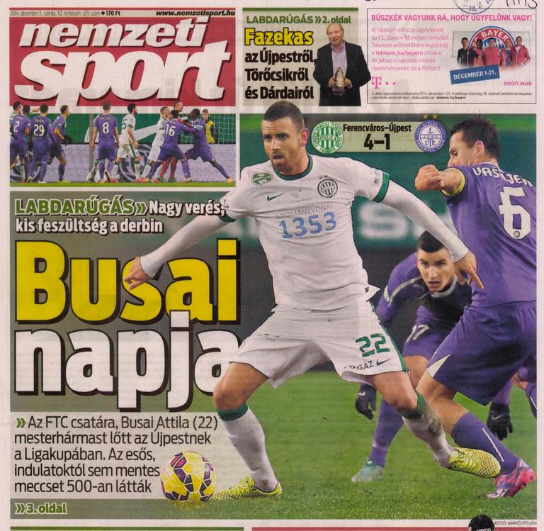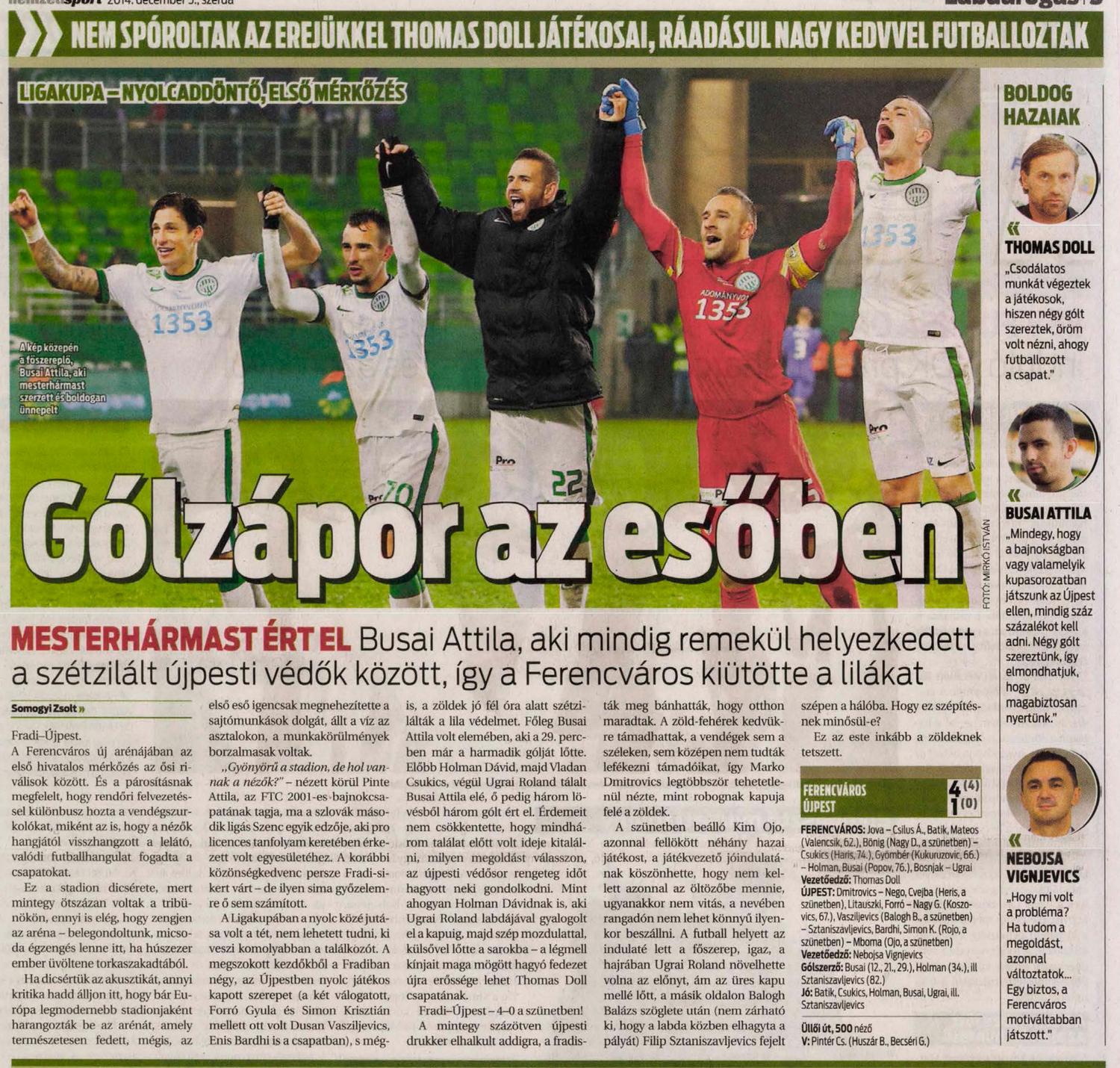 A Ligakupa nyolcaddöntőjében találkozott a Ferencváros az Újpesttel, márpedig ez a párosítás mindig rejt magában izgalmakat. A meccs előtt úgy tűnt, hogy a lila-fehéreknek lesz fontosabb a találkozó, hiszen majdhogynem a legjobb összeállításban küldte pályára fiait Nebojsa Vignjevics. Ehhez képest Thomas Doll inkább a bajnokira összpontosított, nem sokan kaptak szerepet a szokásos kezdőből. Ehhez képest az első félidőben valóságos gálát mutatott be a hazai csapat. Busai már a 12. percben megszerezte a vezetést, és ettől kezdve rendkívül egyoldalú lett a meccs. A lila-fehérek védelme valóságos átjáróház volt, a Fradi támadói többször is kiszolgáltatott helyzetbe hozták a kapust, aki nem tudta útját állni a végletekig kijátszott helyzeteknek. Busai a 21. és a 29. percben is betalált, félóra is elég volt neki a mesterhármashoz. A 34. percben pedig már megvolt a negyedik is, ezúttal Holman váltotta gólra Ugrai átadását.