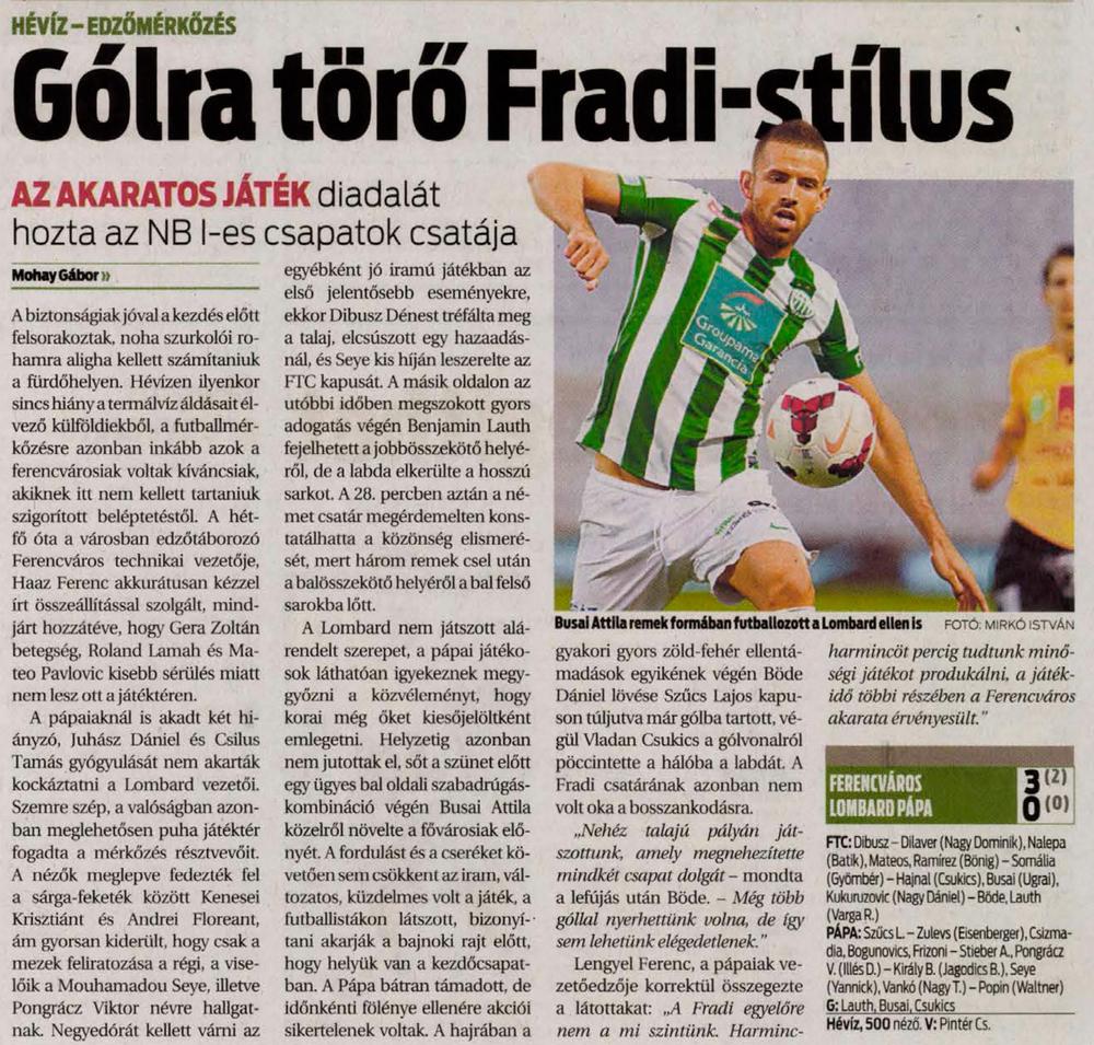 A törökországi edzőtábort hévízire cserélő, a felkészülési időszakban még hibátlan Ferencváros második élvonalbeli ellenfelével találkozott. Korábban 3–1-re nyert a Kecskemét ellen, ezúttal a Pápa következett.