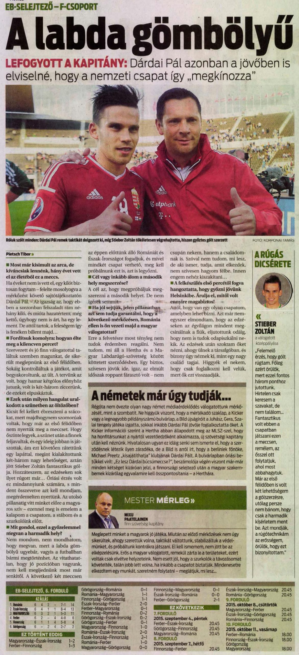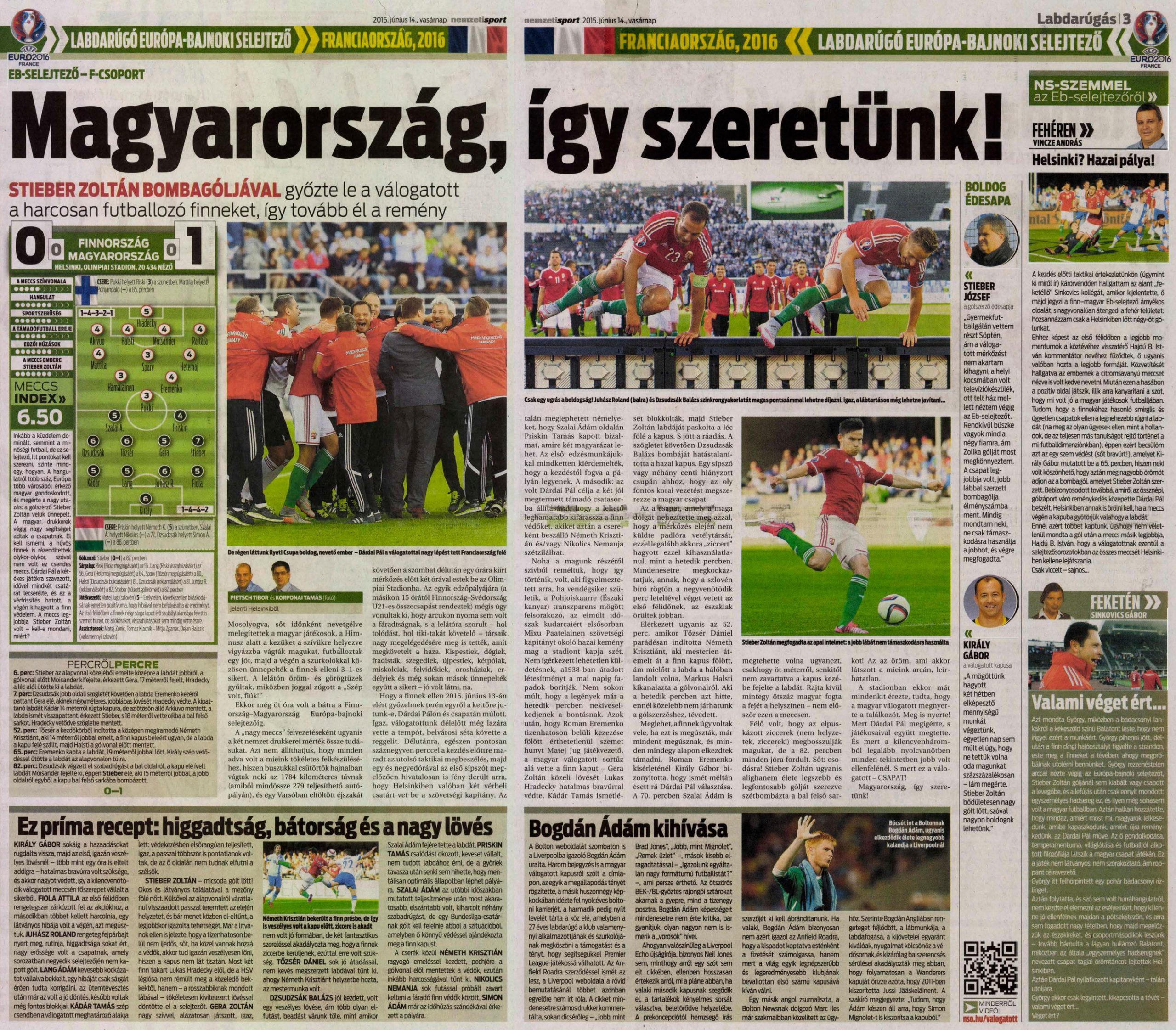 A magyar labdarúgó-válogatott Finnországban lépett pályára a 2016-os Európa-bajnoki selejtezősorozat F-csoportjának 6. fordulójában, és a mieink Stieber Zoltán második félidei bombagóljával elhozták a roppant fontos három pontot Helsinkiből.