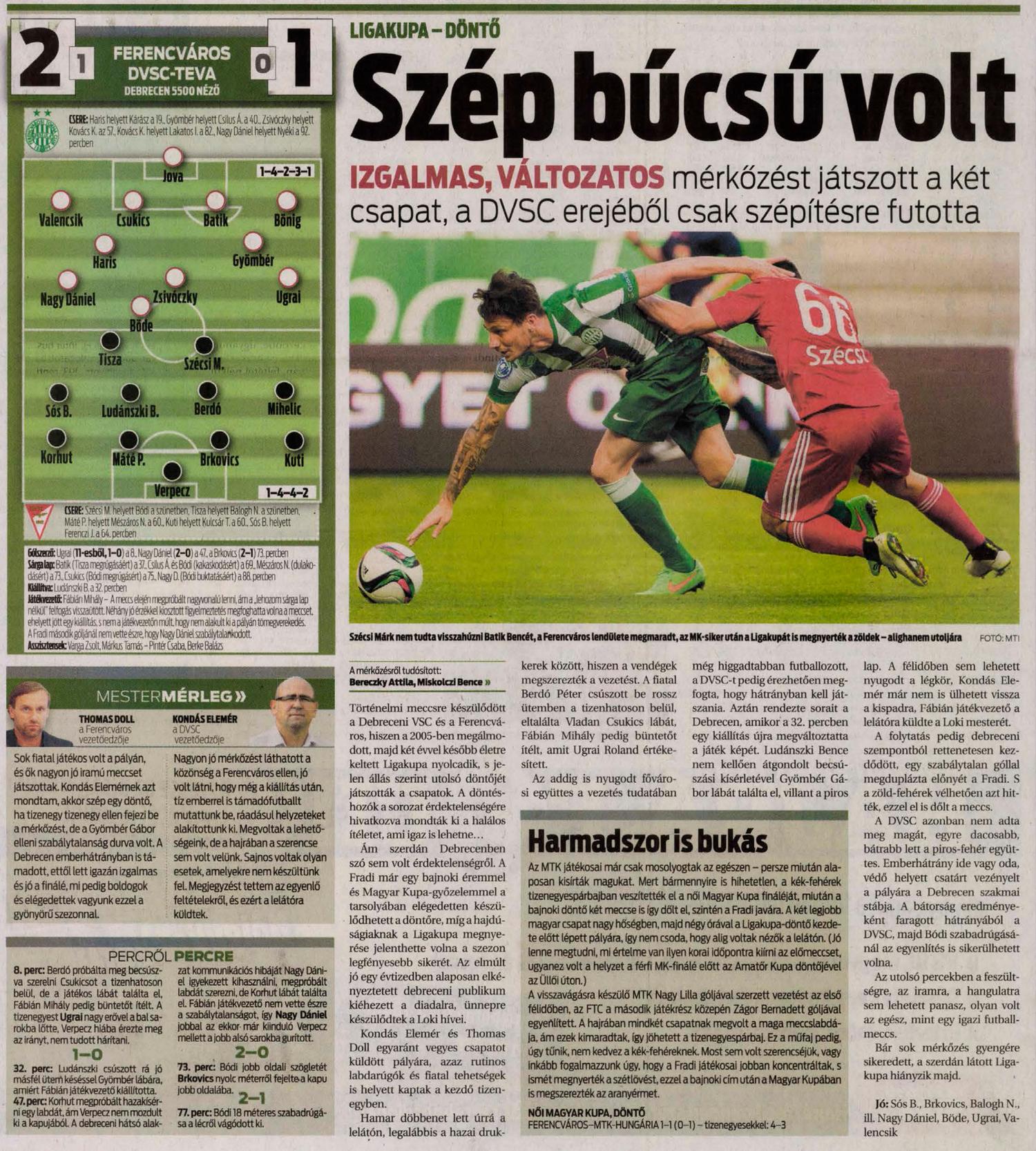 Ritkán lát az ember történelmi futballmérkőzést, márpedig a Debrecen és a Ferencváros összecsapása a tervek szerint az utolsó magyar Ligakupa sorsát volt hivatott eldönteni. Mindkét csapat jó formában fejezte be az idényt, de kissé „elfogyott” a végére, ám ettől függetlenül mindkét vezetőedző tudatosan szerepeltetett a bajnokságban csak ritkán lehetőséget kapó fiatalokat a kezdőben. No, és olyan veteránokat, akik az utolsó mérkőzésüket vívták csapatukban, mint például Philipp Bönig vagy Vladan Csukics, akik közül utóbbi gyorsan kiharcolt egy 11-est (Berdó Péter teljesen fölöslegesen akasztotta), amelyet Ugrai Roland váltott gólra, 0–1!