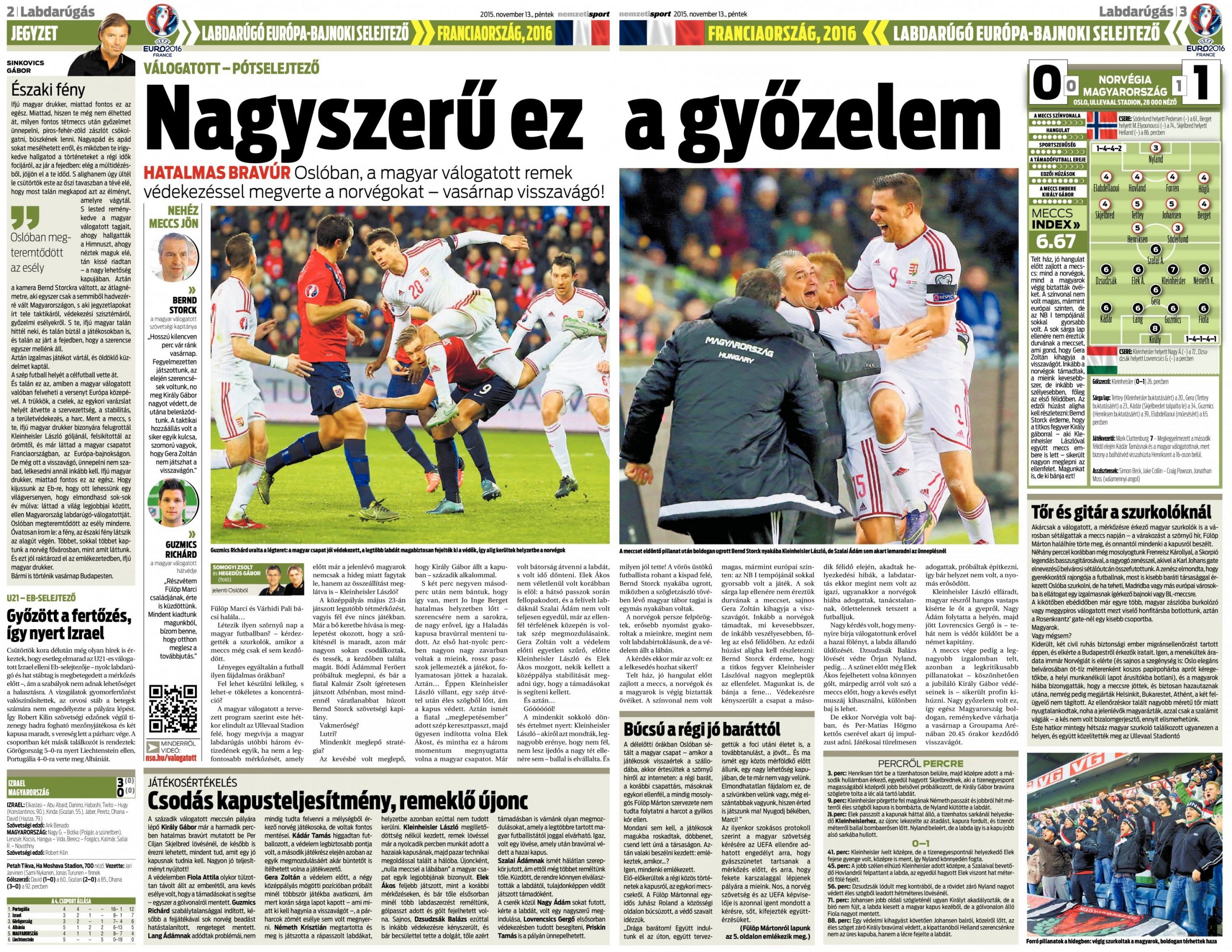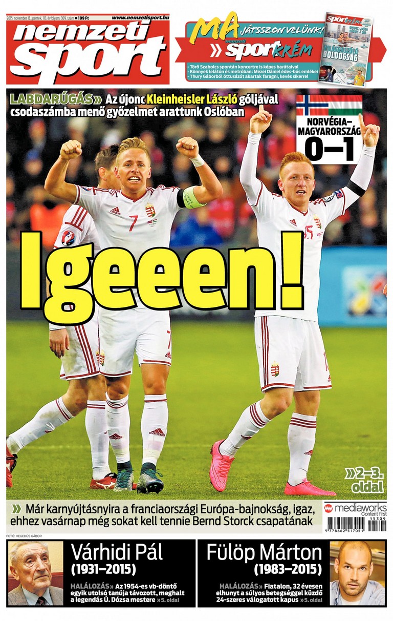 A hajrá a norvégoké volt, a meccs helyzetével. Ekkor azonban Fortuna megkegyelmezett nekünk. Johansen ziccerét előbb védte Király, majd a kipattanót Helland a lécre fejelte a 88. percben. Pedig üres volt a kapu… Hét perccel később pedig egymás nyakába ugrottak a magyar játékosok – nyertünk Norvégiában.