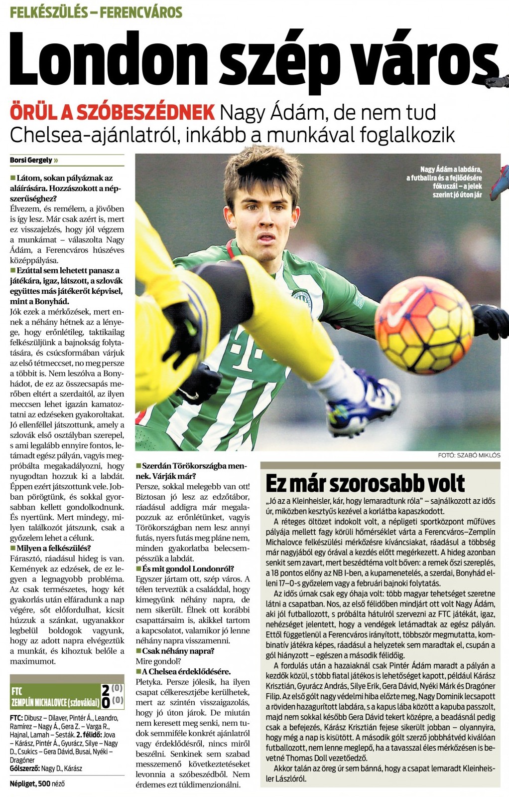 Nagy Dominik: – Erős, jól összerakott csapat benyomását keltette az ellenfél, nagyjából azt hozták, amire számí­tottunk. A gólom előtt sikerült lefülelnem egy rossz átadásukat, amiből helyzetbe kerültem, és elpasszoltam a labdát a kapus lábai között. Erőben, dinamikában jók voltunk a sok hosszú távú futás után. Az edzőtáborban már a tempóra fogunk gyúrni.