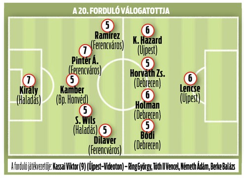 | Király (Haladás) 7 – Dilaver (Ferencváros) 5, S. Wils (Haladás) 5, Kamber (Bp. Honvéd) 5, Pintér Á. (Ferencváros) 7, Ramírez (Ferencváros) 5 – Bódi (DVSC) 5, Holman (DVSC) 6, Horváth Zs. (DVSC) 5, K. Hazard (Újpest) 6 – Lencse (Újpest) 6 A forduló játékvezetője: Kassai Viktor (Újpest – Videoton) 9 – Ring György, Tóth II Vencel, Németh Ádám, Berke Balázs |