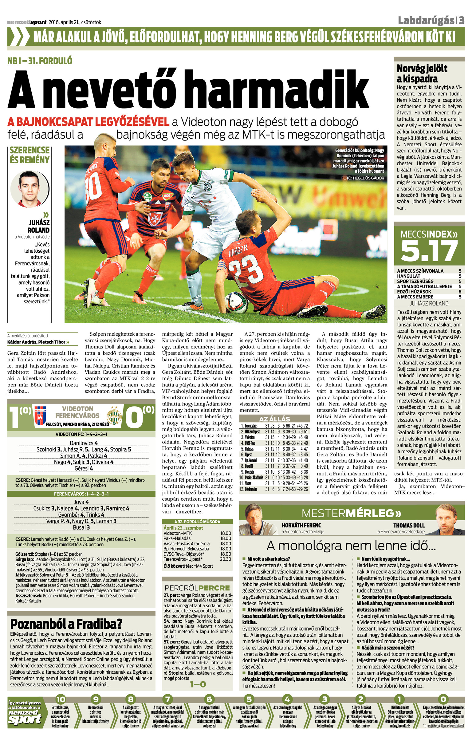 NB I, 31. forduló, április 20., Pancho Aréna. Játékvezető: Solymosi Péter.