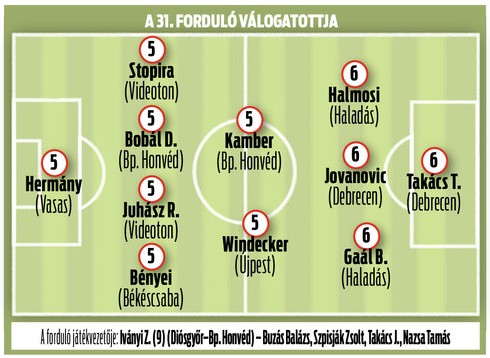 | Hermány (Vasas) 5 – Bényei (Békéscsaba) 5, Juhász R. (Videoton) 5, Bobál D. (Bp. Honvéd) 5, Stopira (Videoton) 5 – Windecker (Újpest) 5, Kamber (Bp. Honvéd) 5 – Gaál B. (Haladás) 6, Jovanovic (DVSC) 6, Halmosi (Haladás) 6 – Takács T. (DVSC) 6 A forduló játékvezetője: Iványi Zoltán (DVTK – Bp. Honvéd) 9 – Buzás Balázs, Szpisják Zsolt, Takács János, Nazsa Tamás |