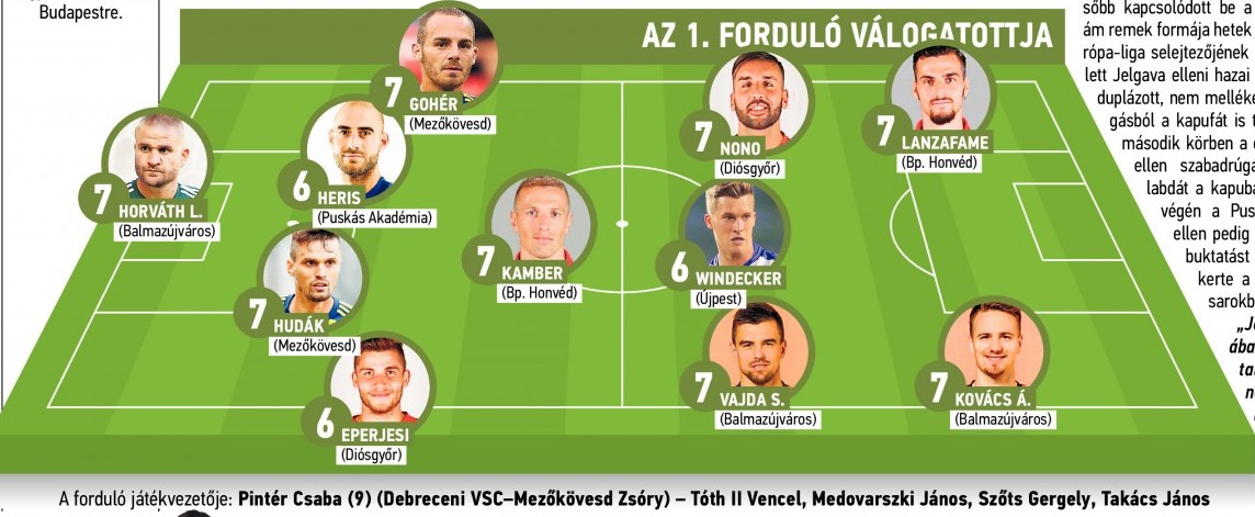| Horváth L. (Balmazújváros) 7 — Eperjesi (DVTK) 6, Hudák (Mezőkövesd) 7, Heris (Puskás Akadémia) 6, Gohér (Mezőkövesd) 7 — Kamber (Bp. Honvéd) 7 — Vajda S. (Balmazújváros) 7, Windecker (Újpest) 6, Nono (DVTK) 7 — Kovács Á. (Balmazújváros), Lanzafame (Bp. Honvéd) 7 A forduló játékvezetője: Pintér Csaba (DVSC — Mezőkövesd) 9 — Tóth II. Vencel, Medovarszki János, Szőts Gergely, Takács János |