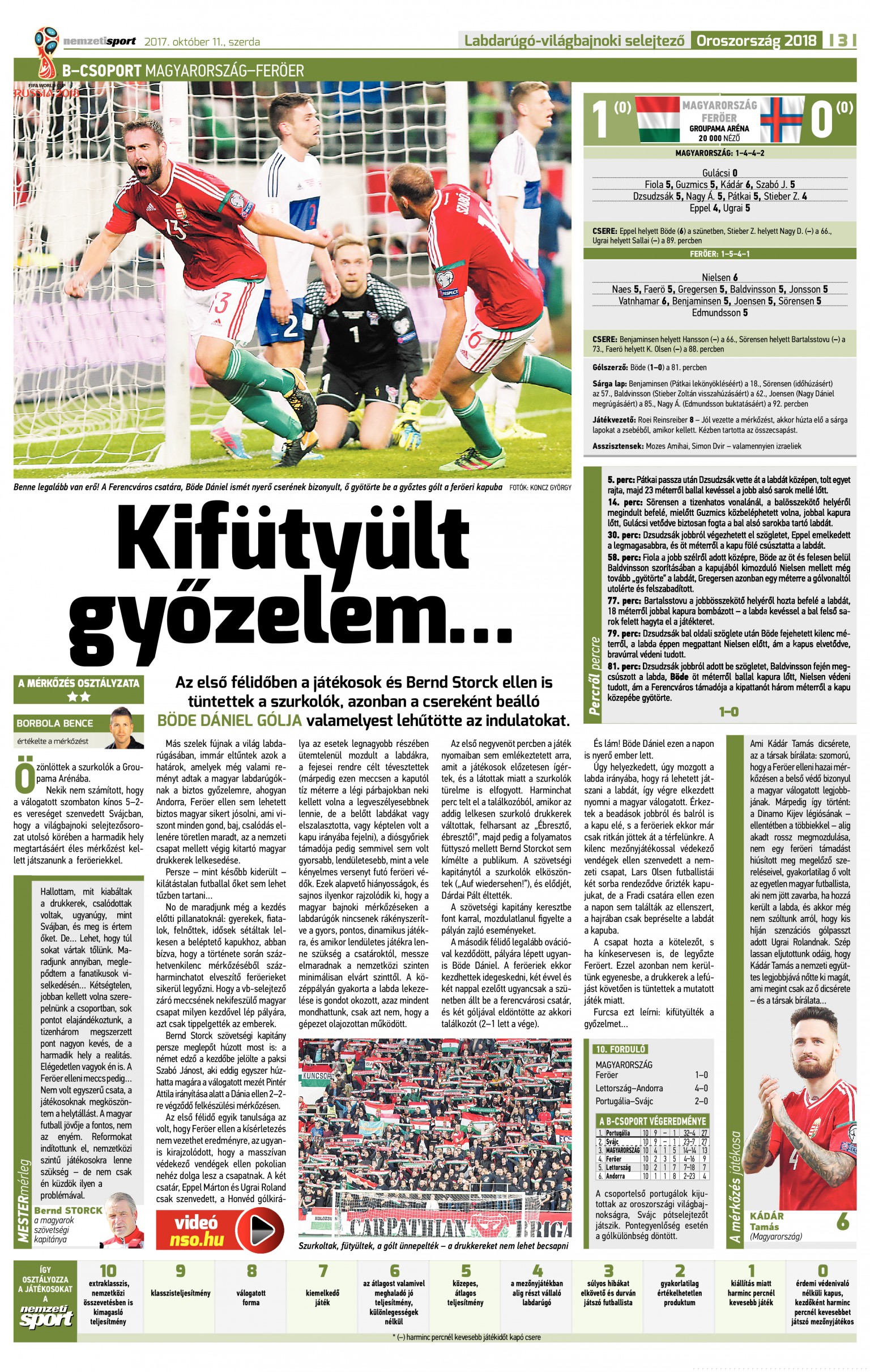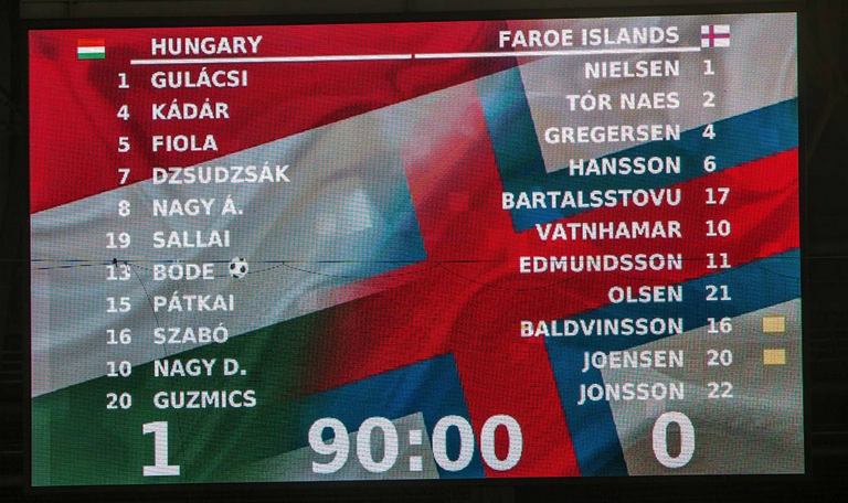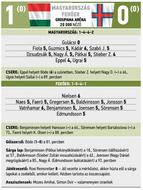 A magyar labdarúgó-válogatott 1–0-ra legyőzte hazai pályán Feröert az európai vb-selejtezők csoportszakaszának utolsó fordulójában. A mieink gólját a csereként beálló Böde Dániel szerezte a 81. percben.