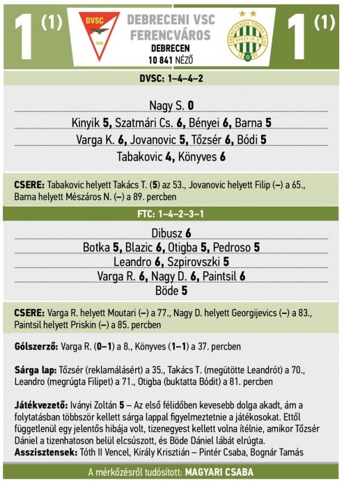 DVSC: Nagy S. — Kinyik, Szatmári Cs., Bényei, Barna (Mészáros N., 90.) — Varga K., Jovanovic (Filip, 65.), Tőzsér, Bódi — Tabakovic (Takács T., 52.), Könyves