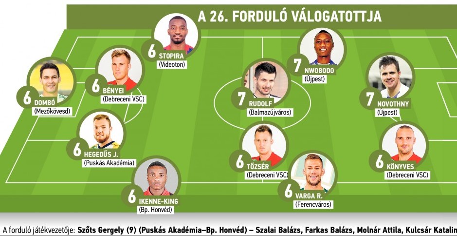 | Dombó (Mezőkövesd) 6 — Ikenne-King (Bp. Honvéd) 6, Hegedűs J. (Puskás Akadémia) 6, Bényei (DVSC) 6, Stopira (Videoton) 6 — Varga R. (Ferencváros) 6, Tőzsér (DVSC) 6, Rudolf (Balmazújváros) 7, Nwobodo (Újpest) 7 — Könyves (DVSC) 6, Novothny (Újpest) 7 A forduló játékvezetője: Szőts Gergely (Puskás Akadémia — Bp. Honvéd) 9 — Szalai Balázs, Farkas Balázs, Molnár Attila, Kulcsár Katalin |