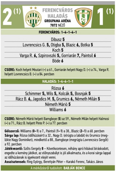 Ferencváros: Dibusz — Lovrencsics G., Otigba, Blazic, Botka — Koch (Moutari, 61.) — Varga R. (Lovrencsics B., 84.), Spirovski, Gorriarán (Nagy D., 74.), Paintsil — Böde