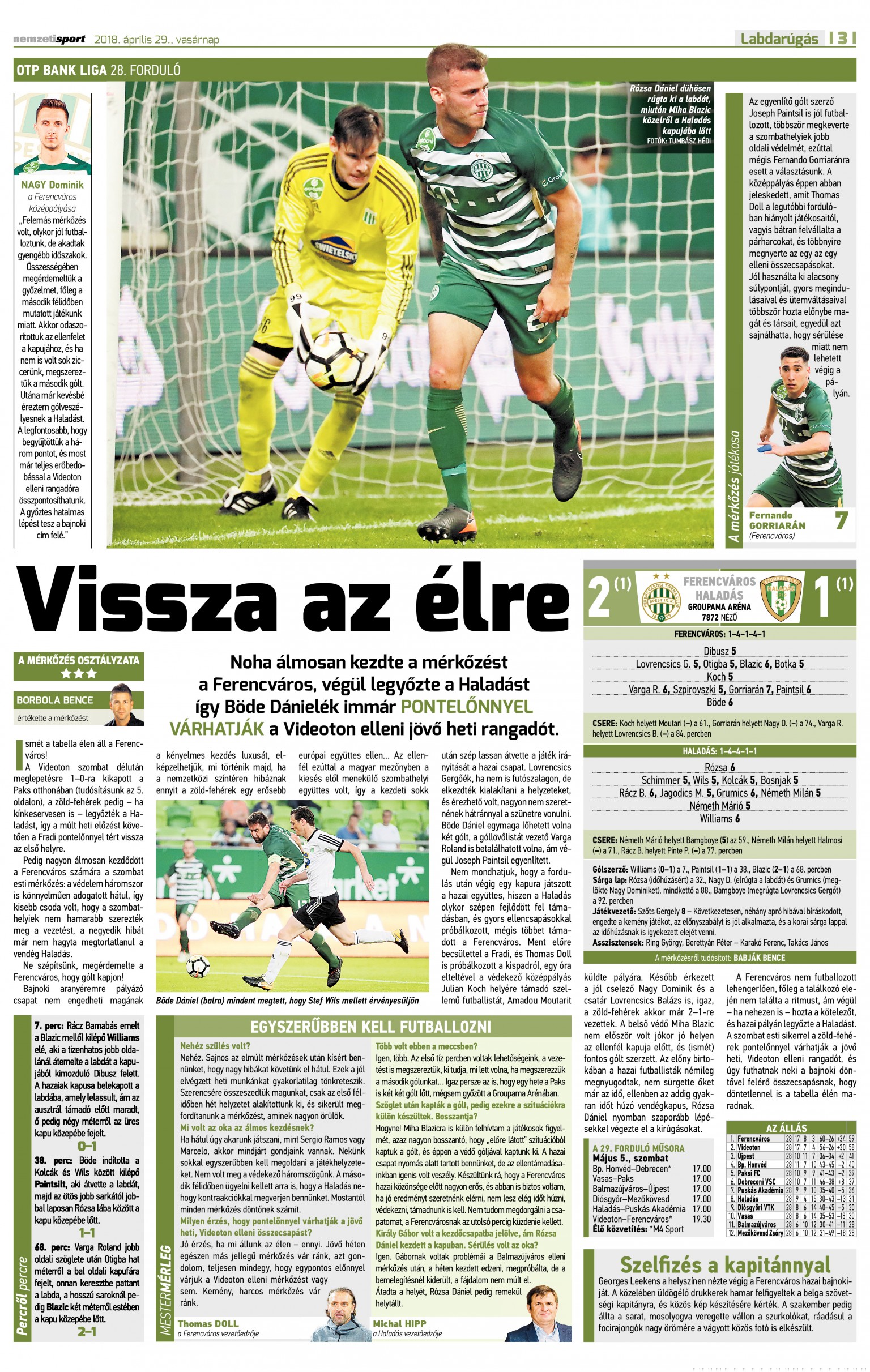 A labdarúgó NB I 28. fordulójának záró mérkőzésén a Ferencváros hazai pályán 2–1-re fordított a Haladás ellen, így a Videoton paksi botlását kihasználva visszavette a vezetést a tabellán.
