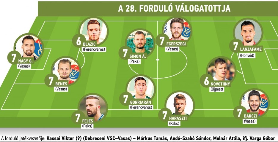 | Nagy G. (Vasas) 7 — Fejes (Paks) 7, Benes (Vasas) 7, Blazic (Ferencváros) 6 — Haraszti (Paks) 7, Gorriarán (Ferencváros) 7, Simon Á. (Paks) 7, Egerszegi (Vasas) 7 — Barczi (Vasas) 7, Novothny (Újpest) 6, Lanzafame (Bp. Honvéd) 7 A forduló játékvezetője: Kassai Viktor (DVSC — Vasas) 9 — Márkus Tamás, Andó-Szabó Sándor, Molnár Attila, ifj. Varga Gábor |