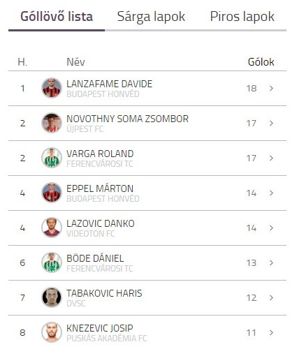 Góllövőlista: