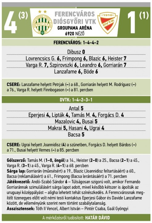 Véget ért a mérkőzés, az FTC 4–1-re legyőzte a DVTK-t!