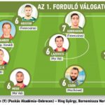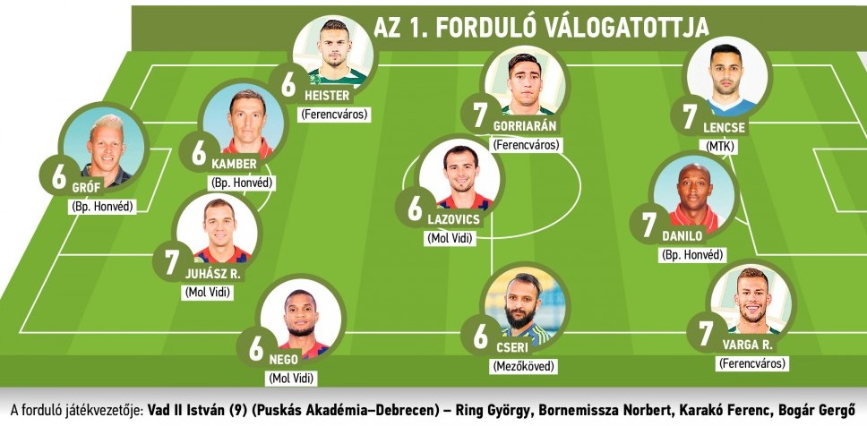 | Gróf (Bp. Honvéd) 6 — Nego (MOL Vidi) 6, Juhász R. (MOL Vidi) 7, Kamber (Bp. Honvéd) 6, Heister (Ferencváros) 6 — Cseri (Mezőkövesd) 6, Lazovic (MOL Vidi) 6, Gorriarán (Ferencváros) 7 — Varga R. (Ferencváros) 7, Danilo (Bp. Honvéd) 7, Lencse (MTK) 7 A forduló játékvezetője: Vad II. István (Puskás Akadémia — DVSC) 9 — Ring György, Bornemissza Norbert, Karakó Ferenc, Bogár Gergő |