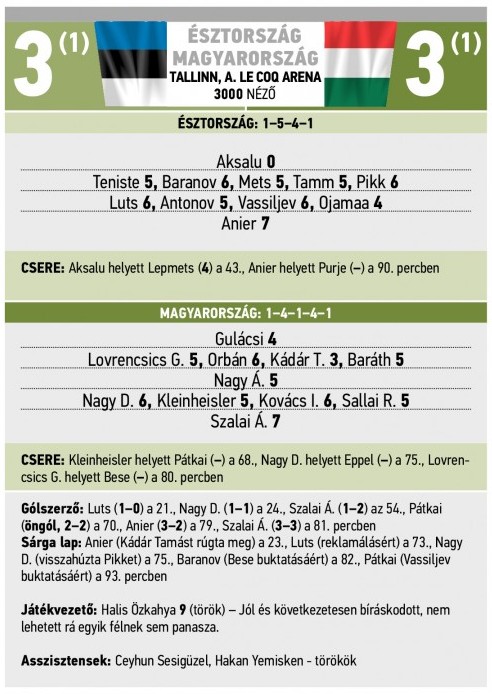 Szerencsére ezen a napon pályán volt Szalai Ádám, aki kevés ideig hagyta örülni az hazaiakat, s a második góljával megmentette a tallinni meccset és a csapat becsületét. Kevesen hittük a mérkőzés előtt, hogy az eddigi három találkozóján sem pontot, sem gólt nem szerző észtek ellen ennek is örülni kell majd.
