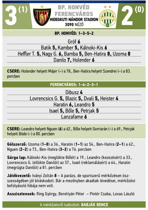 Bp. Honvéd: Gróf — Batik, Kamber, Kálnoki-Kis — Heffler T., Nagy G., Bamba, Ben-Hatira (Szendrei, 83.), Uzoma — Danilo, Holender (Májer, 78.)
