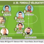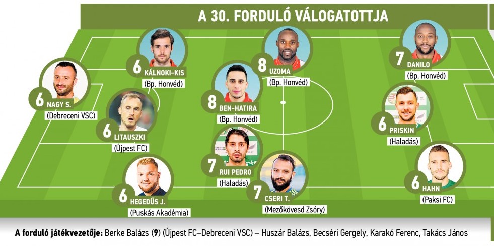 | Nagy S. (DVSC) 6 — Hegedűs J. (Puskás Akadémia) 6, Litauszki (Újpest) 6, Kálnoki-Kis (Bp. Honvéd) 6 — Cseri (Mezőkövesd) 7, Rui Pedro (Haladás) 7, Ben-Hatira (Bp. Honvéd) 8, Uzoma (Bp. Honvéd) 8 — Hahn (Paks) 6, Priskin (Haladás) 6, Danilo (Bp. Honvéd) 7 A forduló játékvezetője: Berke Balázs (Újpest — DVSC) 9 — Huszár Balázs, Becséri Gergely, Karakó Ferenc, Takács János |