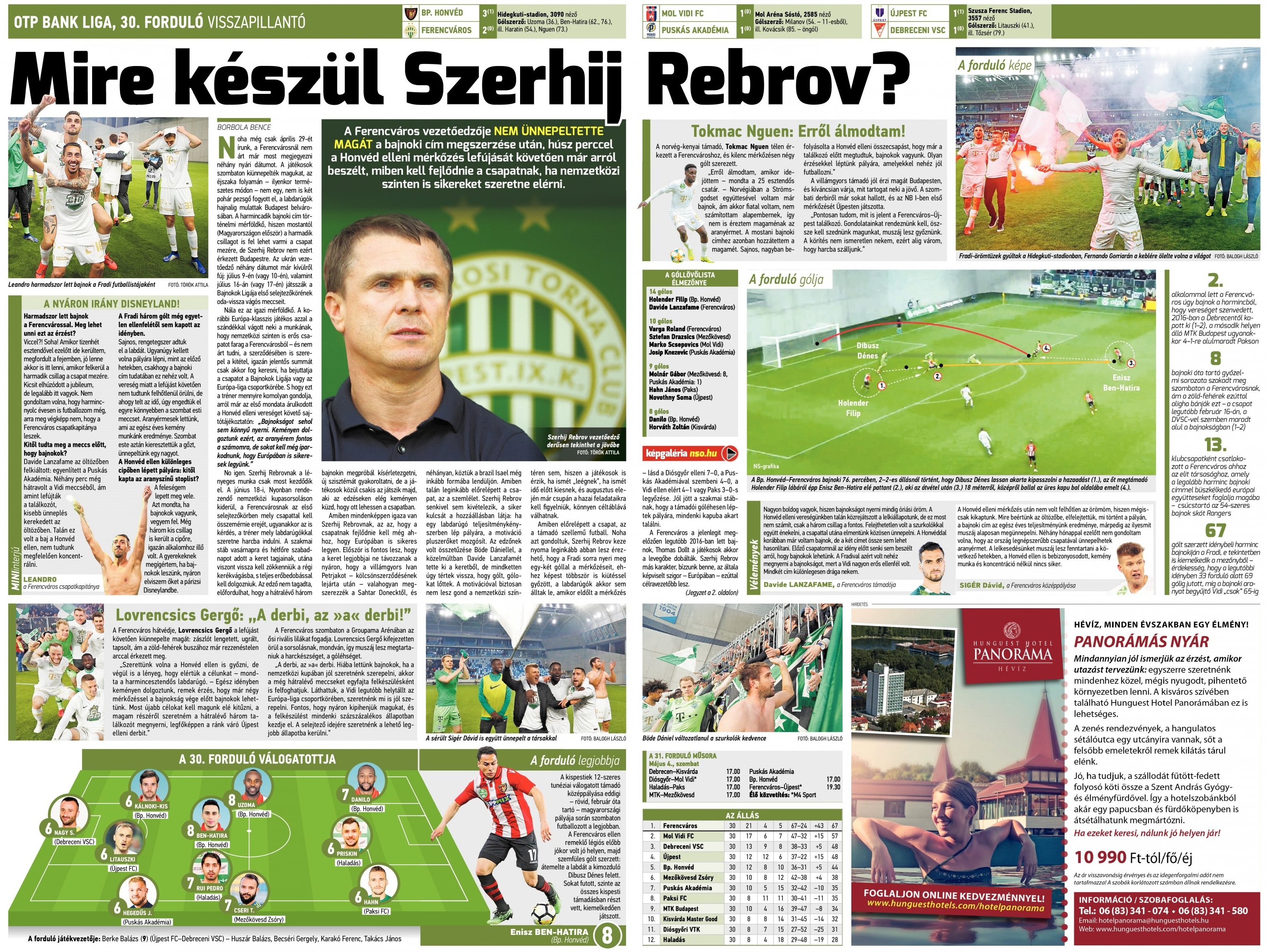 Szerhij Rebrov: — A Vidi legyőzése után csökkent a nyomás a játékosokon, ez érezhető. Ugyanakkor elmondtam a fiúknak, hogy négy meccsünk van még a szezonból, és ezeken is azt várom tőlük, hogy maximum fordulaton pörögjenek. Nem szabad eltérnünk a saját játékunktól. A Honvéd ellen is nehéz mérkőzésre számítok, hiszen ellenfelünk még a dobogóért harcol. Figyeltem a hétközi kupameccsüket is, jobbak voltak a Soroksárnál, de szombaton, ellenünk más lesz a taktikai berendezkedés. Az biztos, hogy az ellenfél motivált lesz, de mi is meg akarjuk mutatni, mire vagyunk képesek!