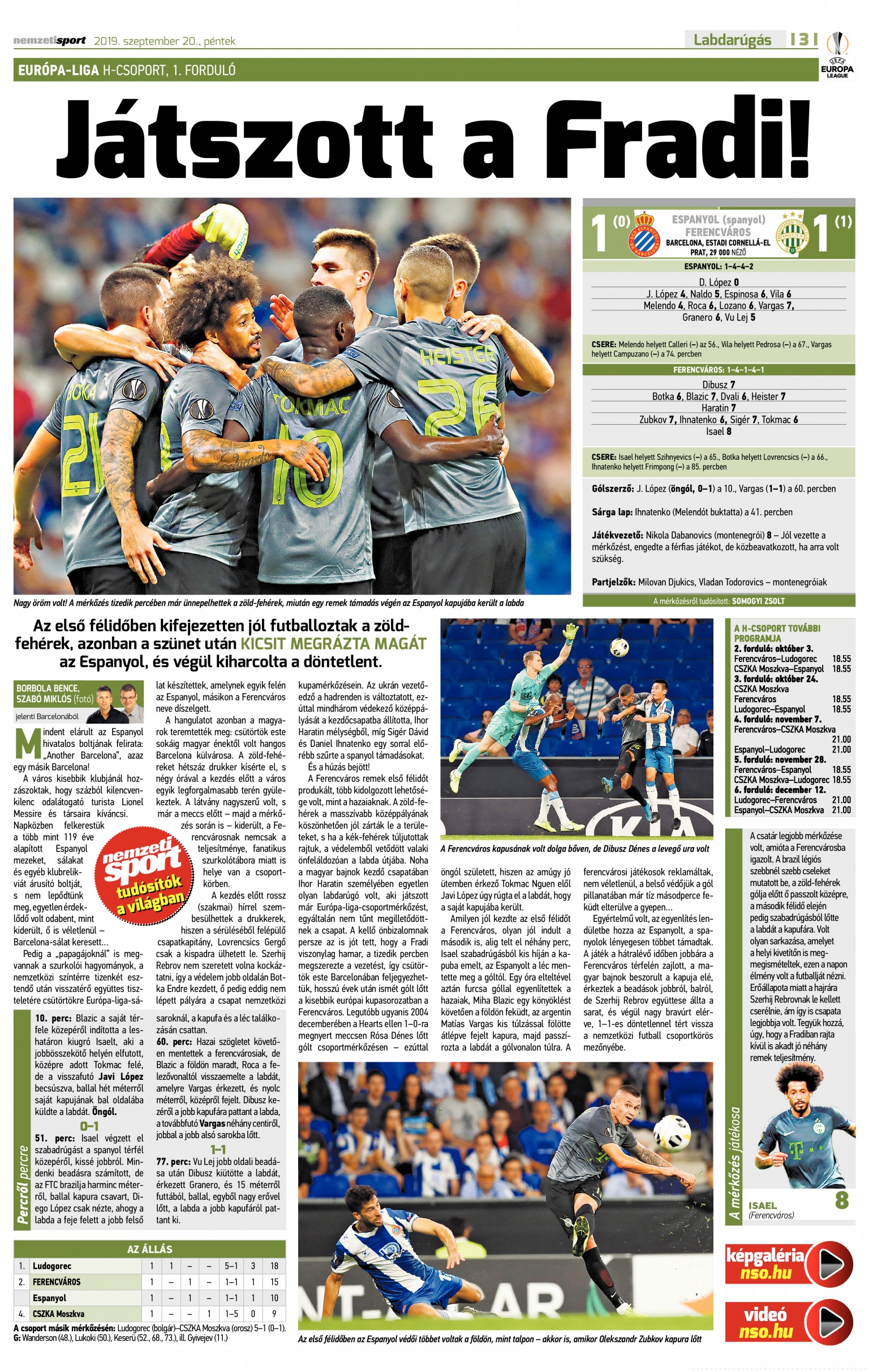 A Ferencváros megkezdte Európa-liga-szereplését Barcelonában, ahol sokáig vezetett az Espanyol ellen, de a hazaiak egyenlítettek, majd nagyon izgalmasra sikeredett a mérkőzés hajrája. A H-csoport másik mérkőzésén a Ludogorec a szünetben még hátrányban volt, végül mégis alapos verésben részesítette vendégét, a CSZKA Moszkvát (5–1).