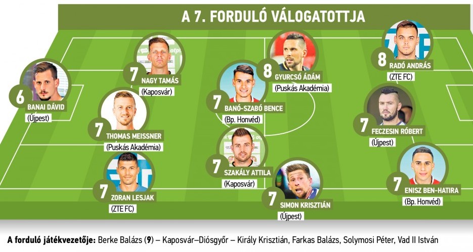 | Banai (Újpest) 6 — Lesjak (ZTE) 7, Meissner (Puskás Akadémia) 7, Nagy T. (Kaposvári Rákóczi) 7 — Simon K. (Újpest) 7, Szakály A. (Kaposvári Rákóczi) 7, Banó-Szabó (Bp. Honvéd) 7, Gyurcsó (Puskás Akadémia) 8 — Ben-Hatira (Bp. Honvéd) 7, Feczesin (Újpest) 7, Radó (ZTE) 8 A forduló játékvezetője: Berke Balázs (Kaposvári Rákóczi — DVTK) 9 — Király Krisztián, Farkas Balázs, Solymosi Péter, Vad II. István |
